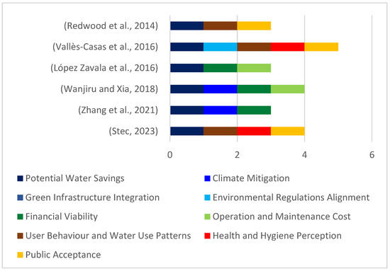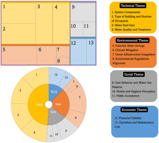 Figure 6 presents the NVivo hierarchy chart and sunburst diagram, illustrating the relative prominence of the four main themes and their sub-themes across the coded literature. Distinct colors are used to differentiate the four thematic categories, with each color corresponding to a specific theme and its associated sub-themes. The yellow color represents the technical theme, encompassing system components, building characteristics, and number of occupants, water end-uses, and water quality or treatment. The orange color reflects the environmental theme, which includes potential water savings, climate mitigation, green infrastructure integration, and alignment with environmental regulations. The gray color corresponds to the social theme, capturing user behavior and water use patterns, health and hygiene perceptions, and public acceptance. Finally, the blue color represents the economic theme, covering financial viability and operation, and maintenance costs. While the size of the boxes reflects the volume of studies addressing each sub-theme, larger boxes indicate sub-themes covered more extensively in the literature, whereas smaller boxes represent those examined in fewer studies. Moreover, prominence distribution across the 40 articles shows technical themes as the most dominant (49%), followed by environmental (24%), social (15%), and economic (12%) themes. Table 2 further details the frequency of individual indicators within the reviewed publications. All studies included the four technical indicators, reflecting their essential role in evaluating HRGS performance. The proportional emphasis on each sustainability dimension was quantified based on the total number of verified indicators (✓) reported across the studies. Environmental indicators, particularly those relating to water-saving potential, were also widely represented, highlighting the significance of RWH and GWR. In contrast, economic and social indicators appeared less frequently.