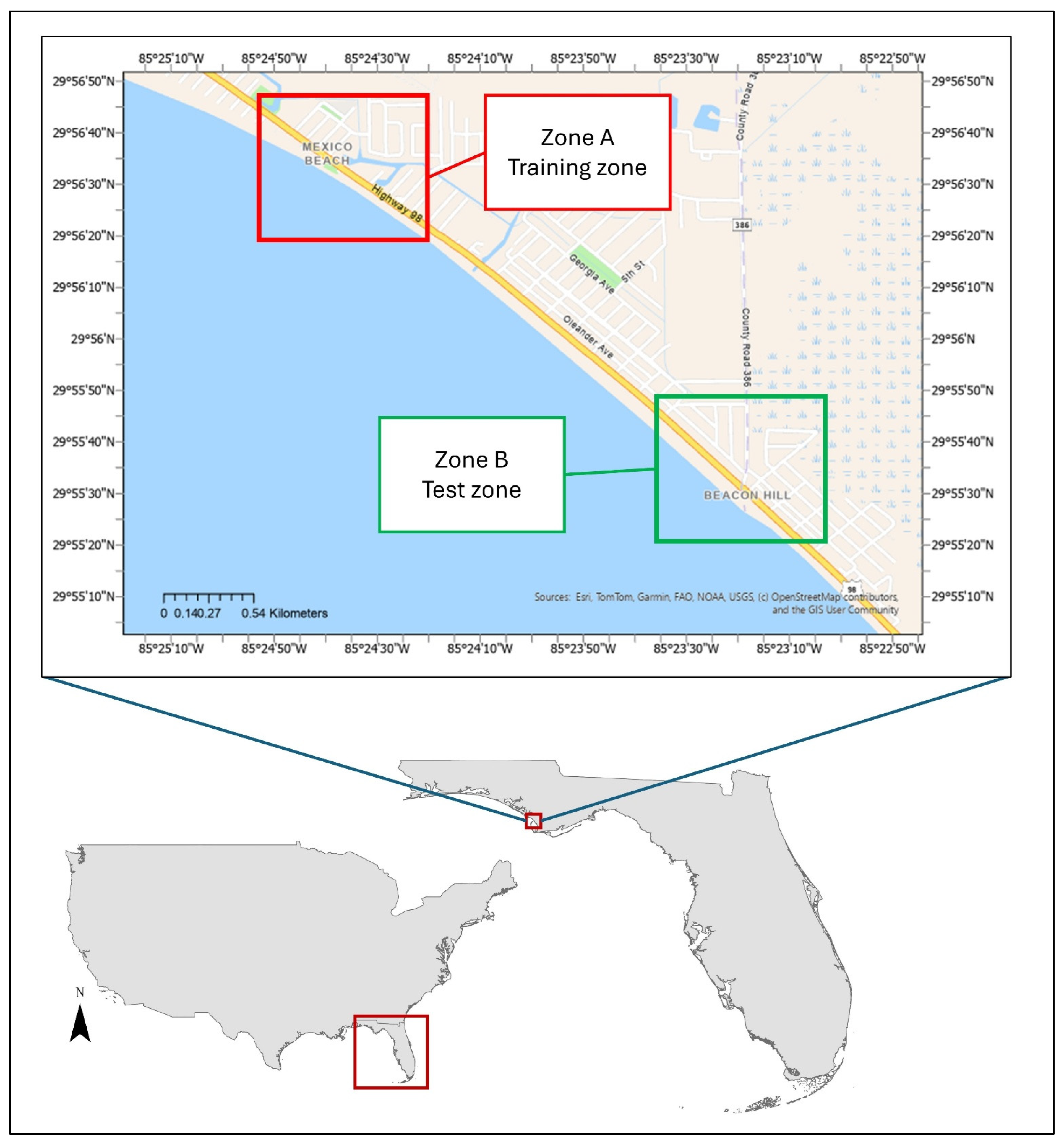 Two non-overlapping areas were defined for training and testing. Zone A (training) covered approximately 2.37 km2, bounded by coordinates Xmin = −9,509,953.48, Ymin = 3,496,203.85 and Xmax = −9,508,209.76, Ymax = 3,497,560.60. Zone B (testing) covered approximately 0.95 km2, bounded by Xmin = −9,506,296.45, Ymin = 3,493,905.81 and Xmax = −9,505,274.10, Ymax = 3,494,851.72. Both zones shared similar environmental characteristics and urban structures, enabling the classifier to generalize effectively. The larger training zone was chosen to ensure exposure to diverse hurricane damage patterns and background features.