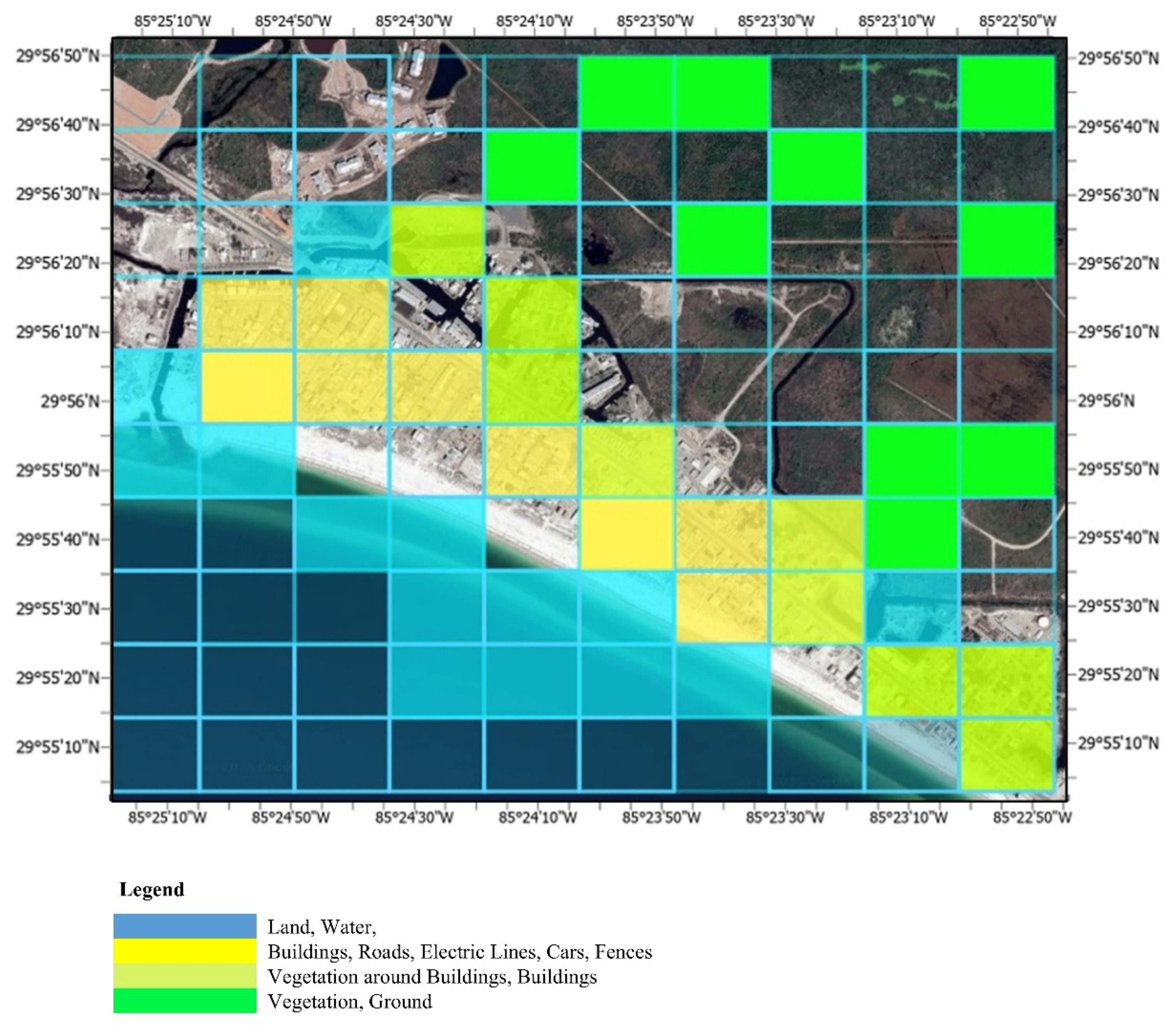 2) in size, to facilitate systematic sampling for semantic labeling. These grids were used solely to organize the selection of training data and to ensure spatial diversity, not to represent LiDAR acquisition resolution. The LiDAR point density remained consistent with the original airborne survey specifications. Within each grid, semantic labeling was performed by integrating LiDAR-derived features with the auxiliary imagery. Ten semantic classes were defined based on relevance to hurricane damage detection and their distinguishable geometry in 3D point clouds: Ground, Road, Vegetation, Building, Ocean/Water, Vehicle, Fence, Power Line, Damaged Building, and Debris. Descriptions of these classes are provided in