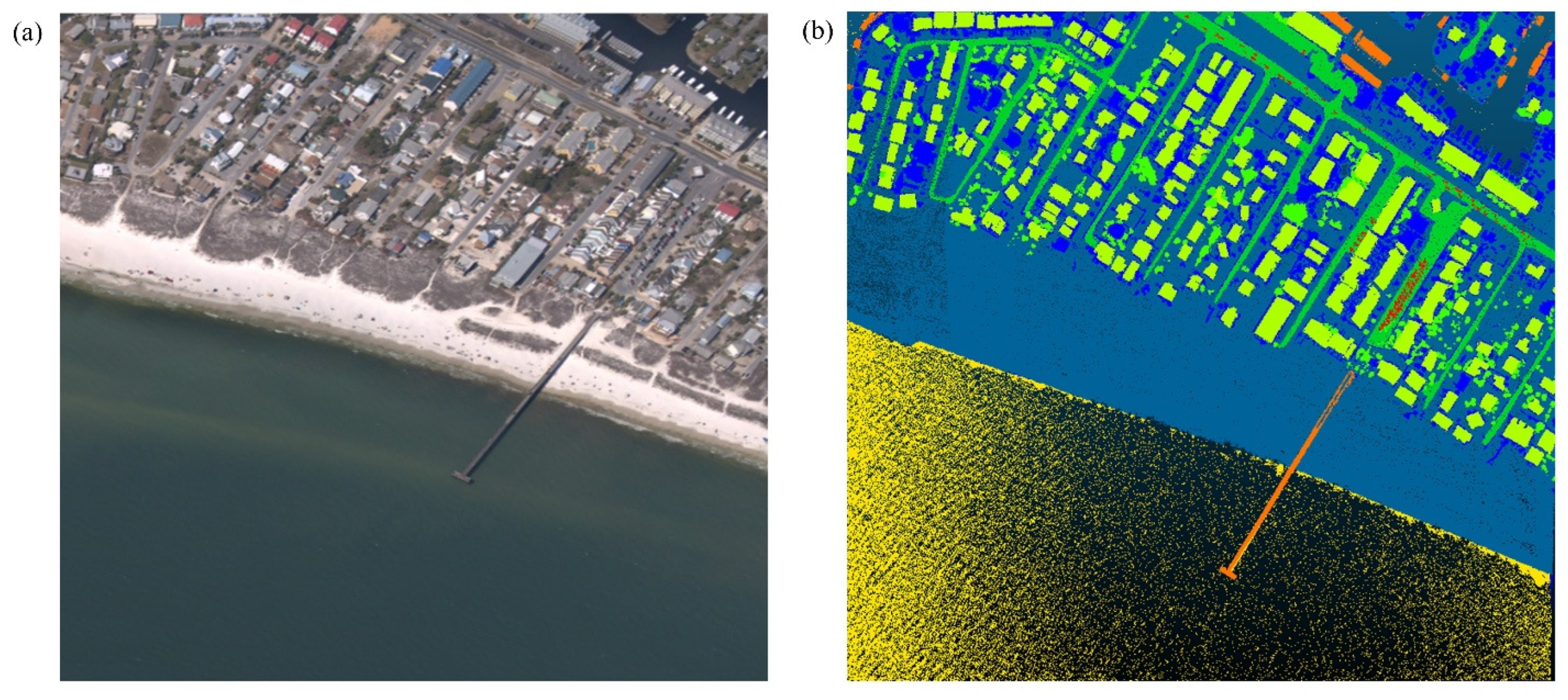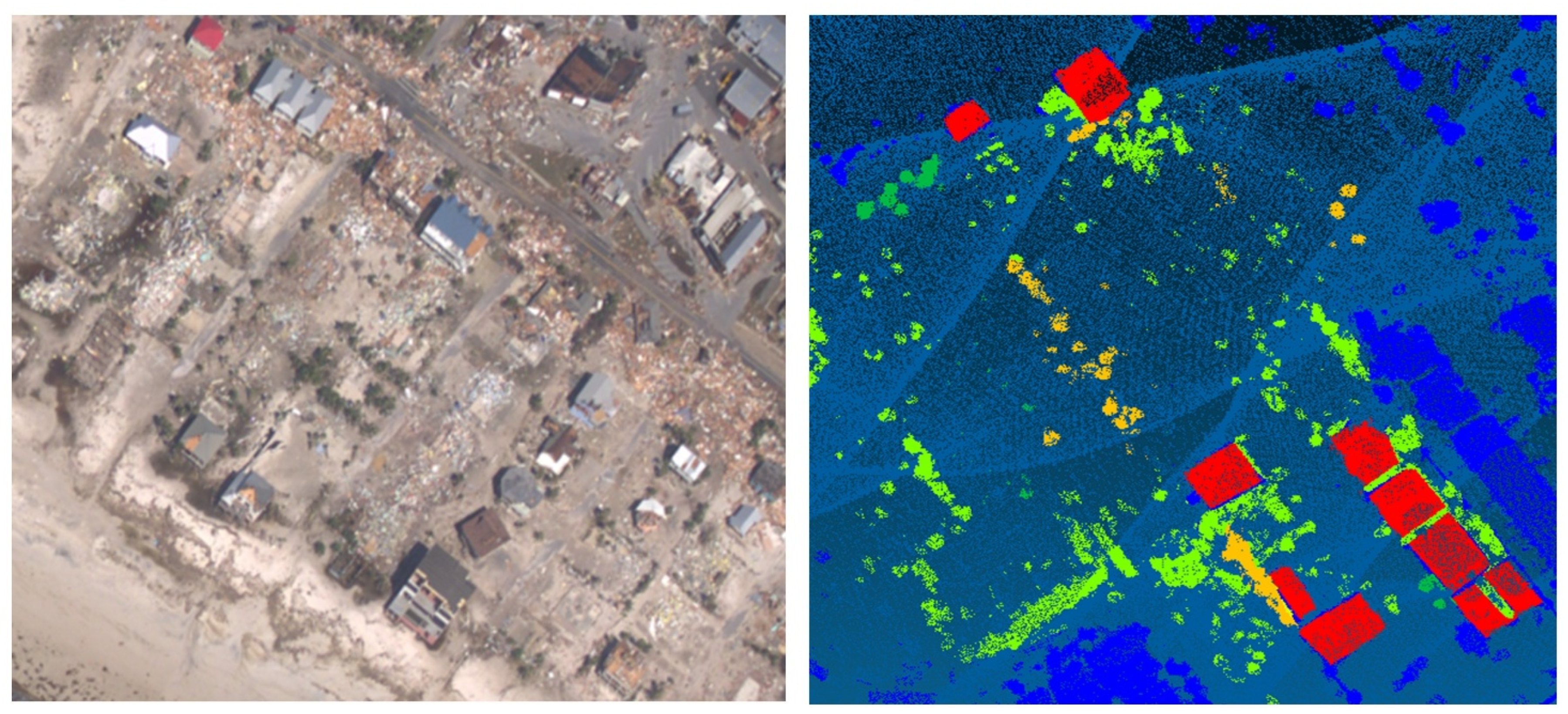 To support visual interpretation and aid manual labeling, high-resolution aerial imagery was integrated into the workflow. Post-event imagery was sourced from the “2018 NOAA National Geodetic Survey (NGS) Disaster Supplemental Survey (DSS) Natural Color 8-Bit” dataset, while pre-event reference imagery was obtained from the “2017 NOAA NGS Oblique Natural Color 8-Bit” dataset. These datasets provided visual confirmation of structural conditions and debris presence where LiDAR features alone were insufficient.