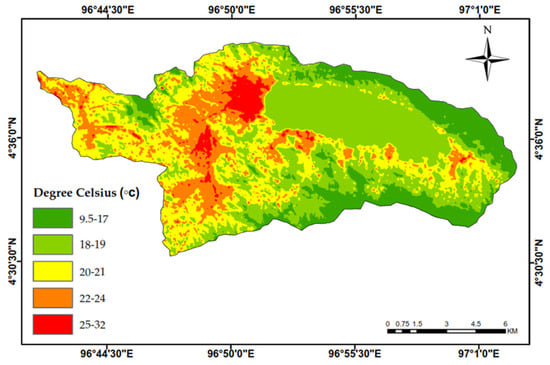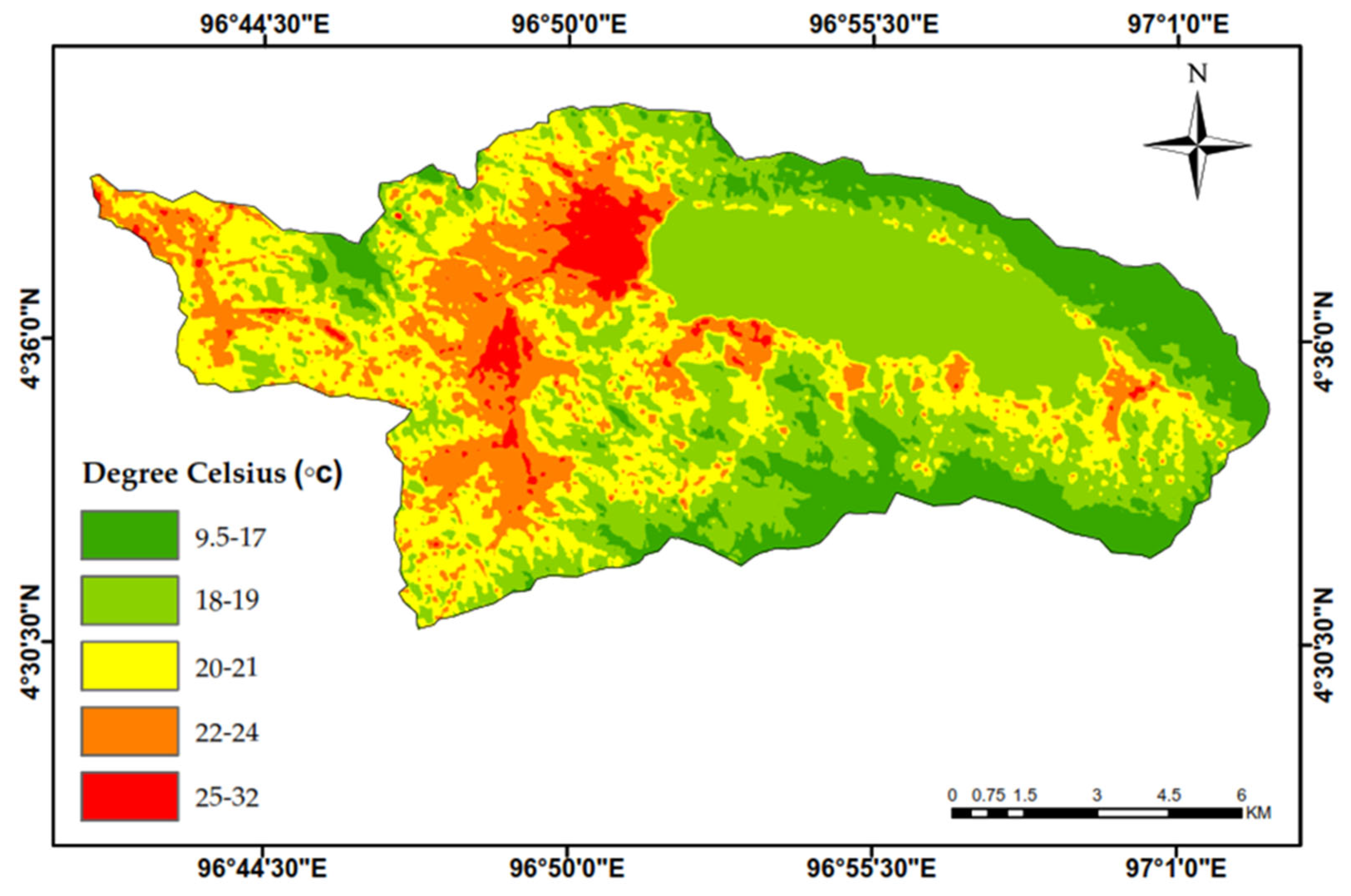 In addition to the exploitation of the visual appearance of Figure 2, understanding of LST’s spatial pattern for certain classes can be enhanced by considering the thermal zones in which the temperature ranges belong. Table 2 summarizes these categories, showing that highland forests and water bodies remain cooler (9.5–17 °C), transitional vegetated slopes demonstrate intermediate temperatures (18–21 °C), and heavily cultivated or urbanized areas are warmer (22–32 °C). This list allows for a more systematic insight into the thermal gradients that exist throughout the entire watershed and their potential ecological or anthropogenic causes.