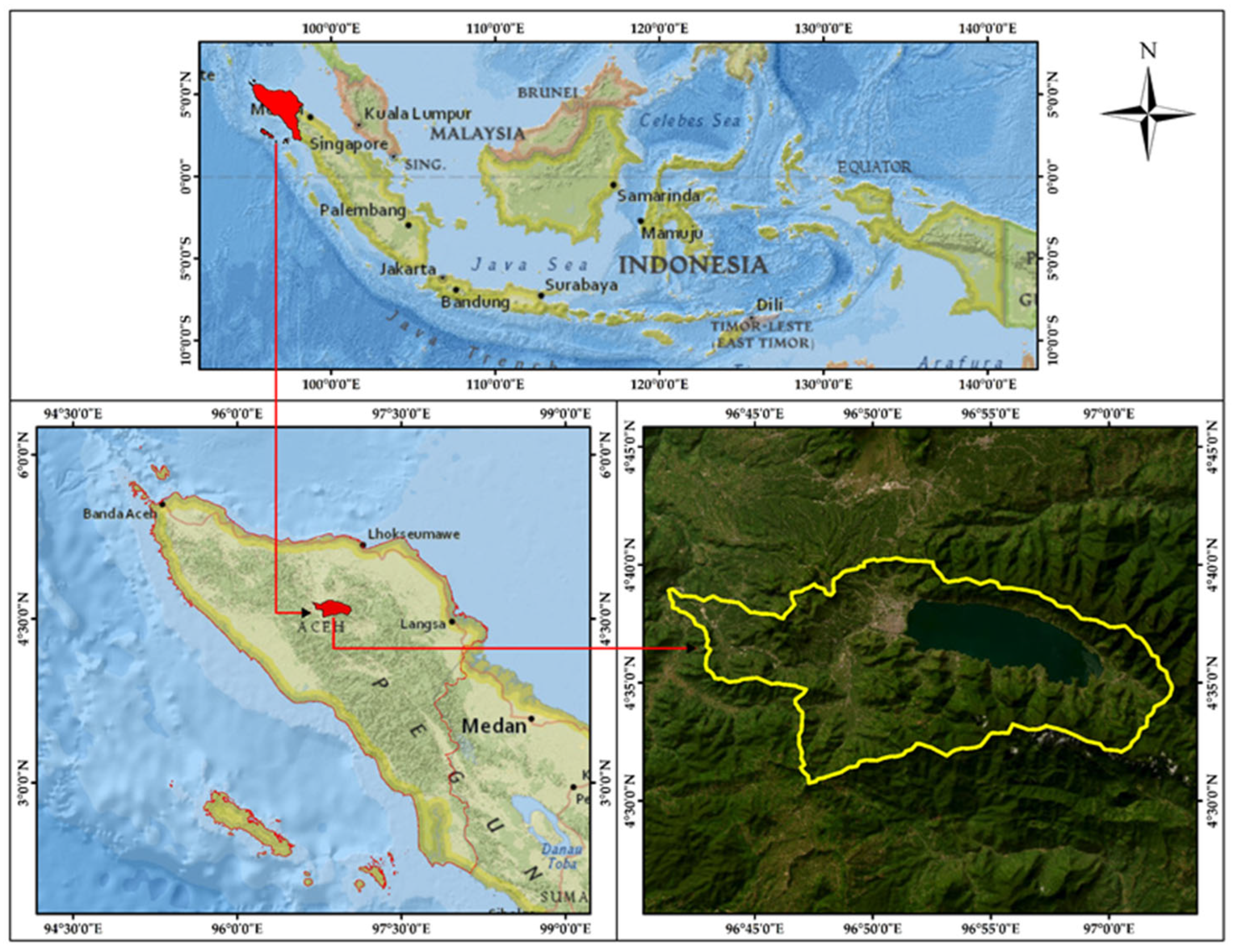 The Laut Tawar sub-watershed, located in the highlands of Central Aceh, Indonesia, is a part of the Gayo Highlands. It is located at a geographical point of 4°36′43″ N, 96°55′25″ E, and this sub-watershed covers a patchwork of landform types and ecosystems with an area of around 5670 hectares, based on delineation from Landsat 9 imagery and topographic analysis. At its center is Lake Laut Tawar, a tectonic freshwater lake that forms the focal point of the region’s hydrology. The 17 km long and 3.2 km wide lake has a maximum depth of 80 m and an average depth of 35 to 51 m (at different distances from shore). Situated at ±1200 m.a.s.l., with a rugged topography in the watershed, the hills and mountainous landscapes play major roles in regulating LST distribution, vegetation distribution patterns, and urban growth dynamics. The sub-watershed of Laut Tawar is situated in Central Aceh, Aceh, Indonesia, as shown in Figure 1. This ecosystem is composed of lake waters, forests, agricultural lands, and ever-increasing human settlements. Laut Tawar Lake is the main water supply for the local population, and it is used for various economic purposes alongside its function as a habitat for native fish species and aquatic plants.