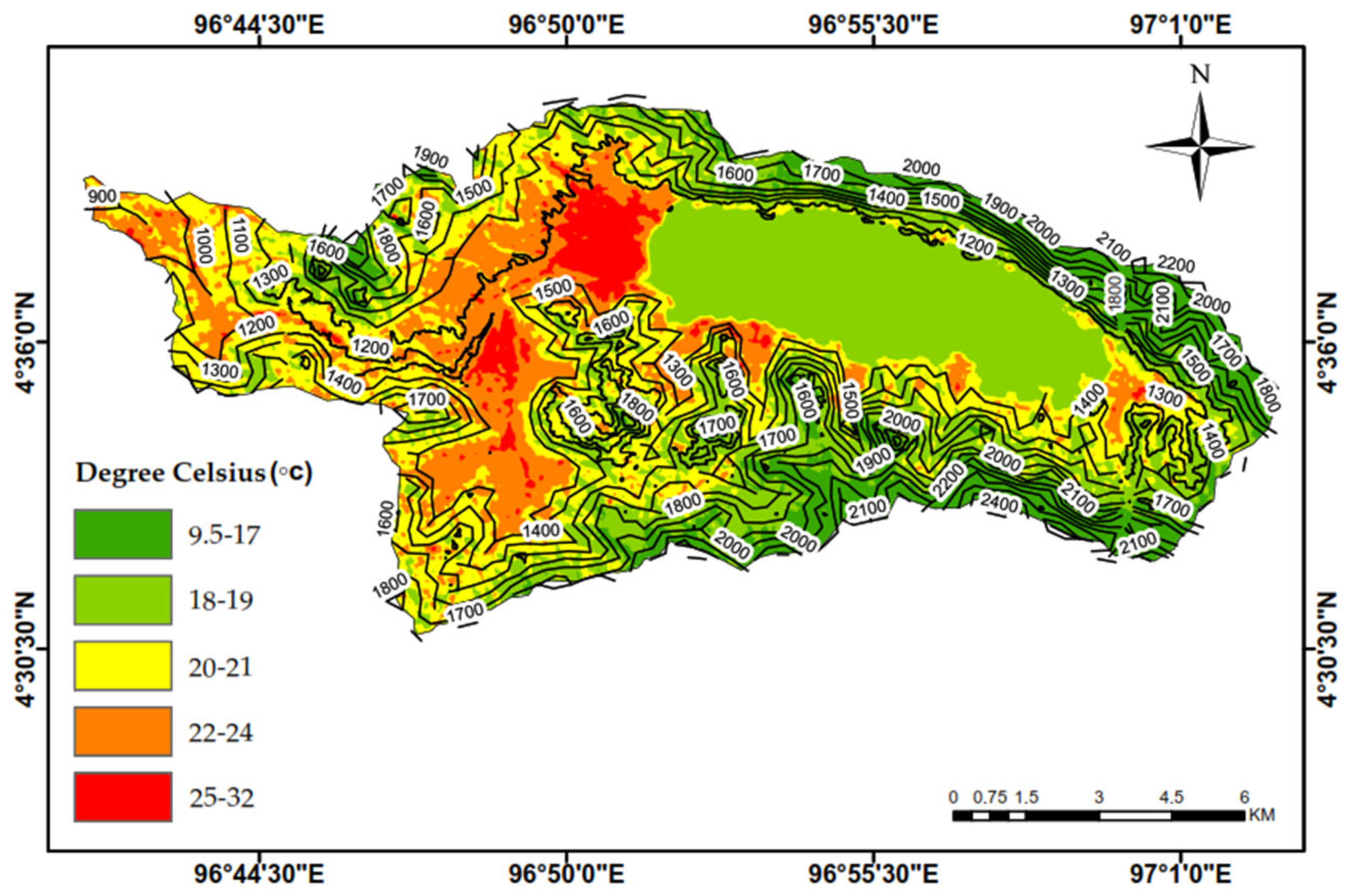 Figure 3 shows the topographic map of the Laut Tawar sub-watershed, in which variation in elevation, slope aspect, and landform are the primary factors affecting the LST distribution in the study area. Topographic features also strongly influence the spatial distribution of LST in the Laut Tawar sub-watershed. The map makes it clear that the dark-green-shaded areas (apparently cooler, from 9.5 to 17 °C) are generally places on flatter land mass (valley), areas shadowed by dense forests, or areas near bodies of water, where natural cooling occurs. These pits offer shade and humidity and exhibit lower surface temperatures, even when the temperature is higher in the direct surroundings.