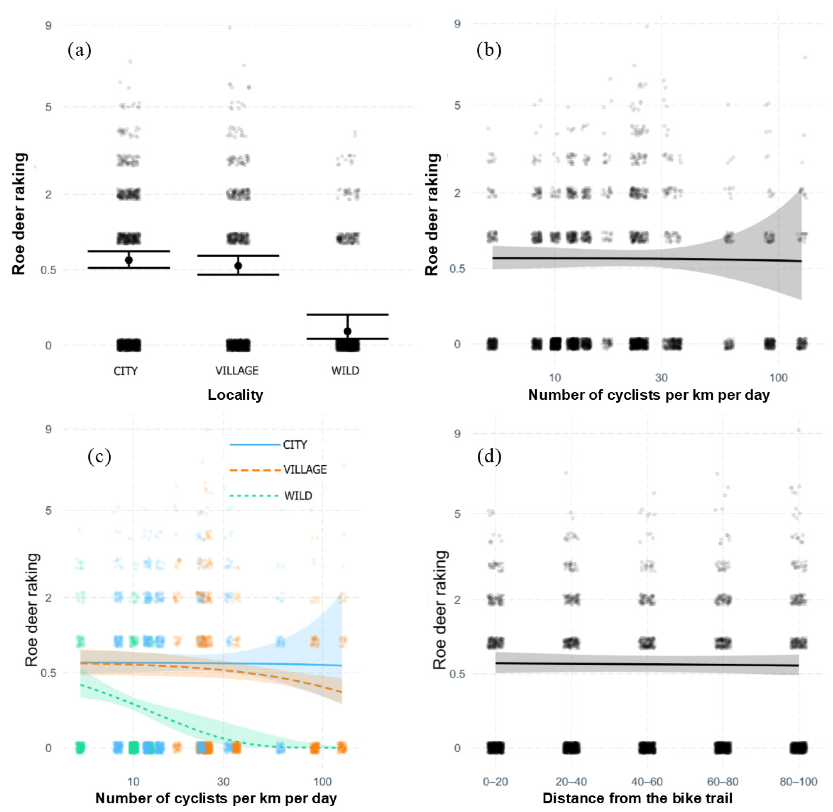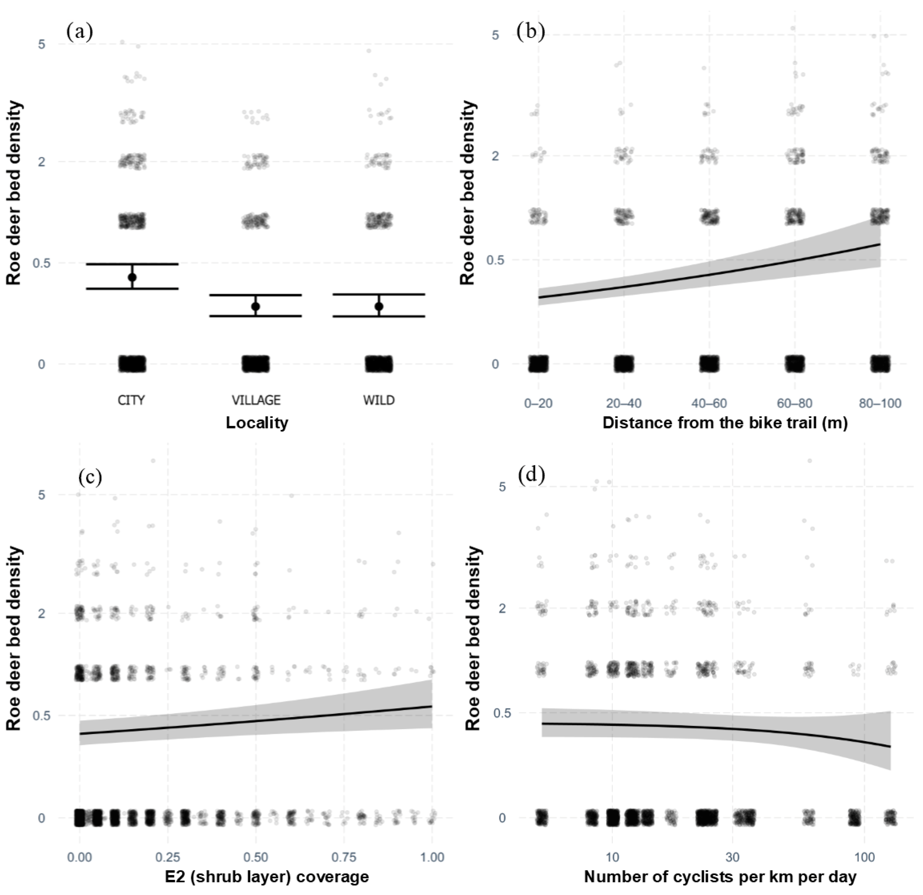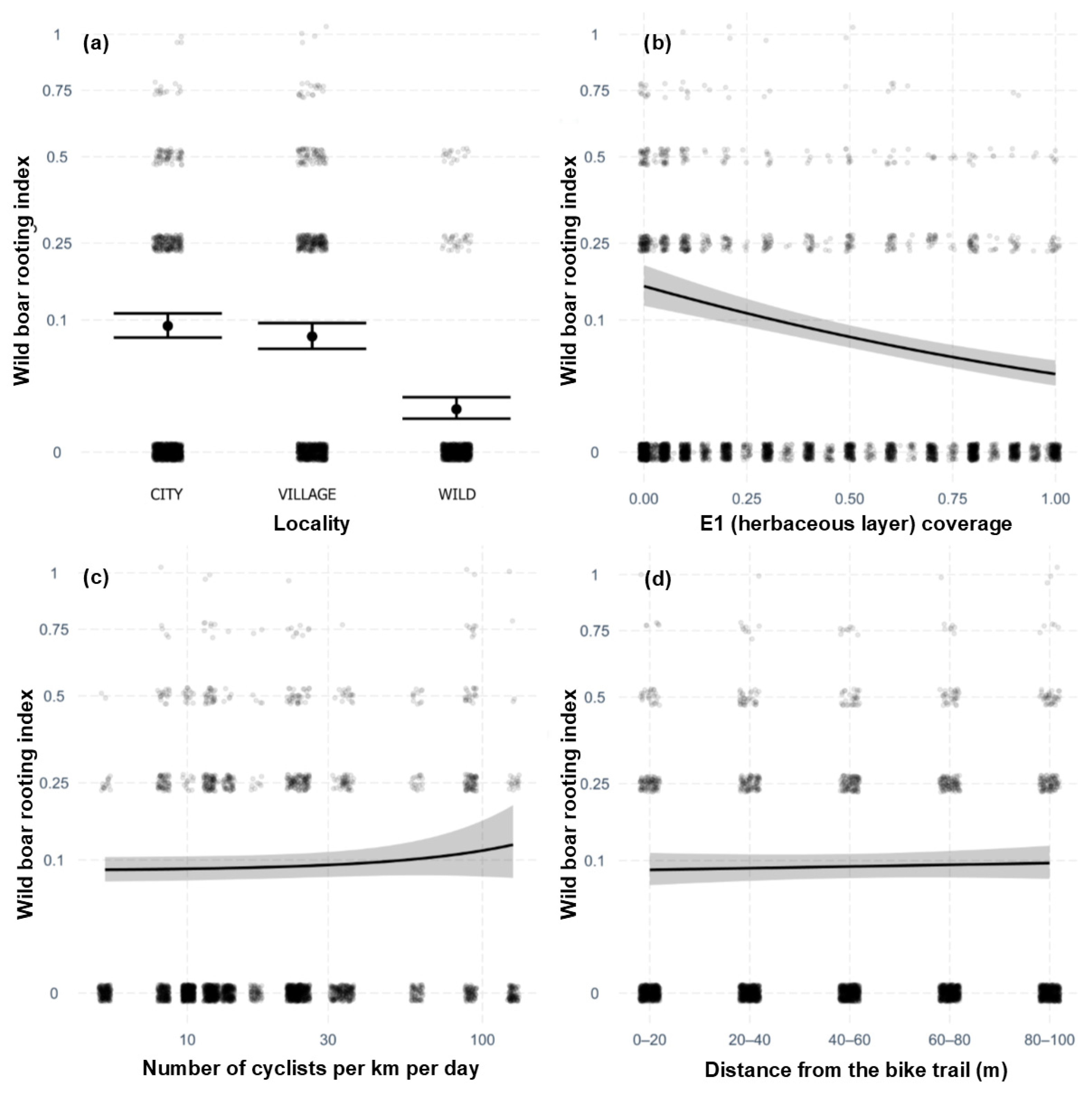 | Locality | Total Number of Cyclists | Roe Deer Raking (Number) | Roe Deer Beds (Number) | Total Wild Boar Rooting Area (m2) | Total Plots with the Presence of Wild Boar Rooting |
