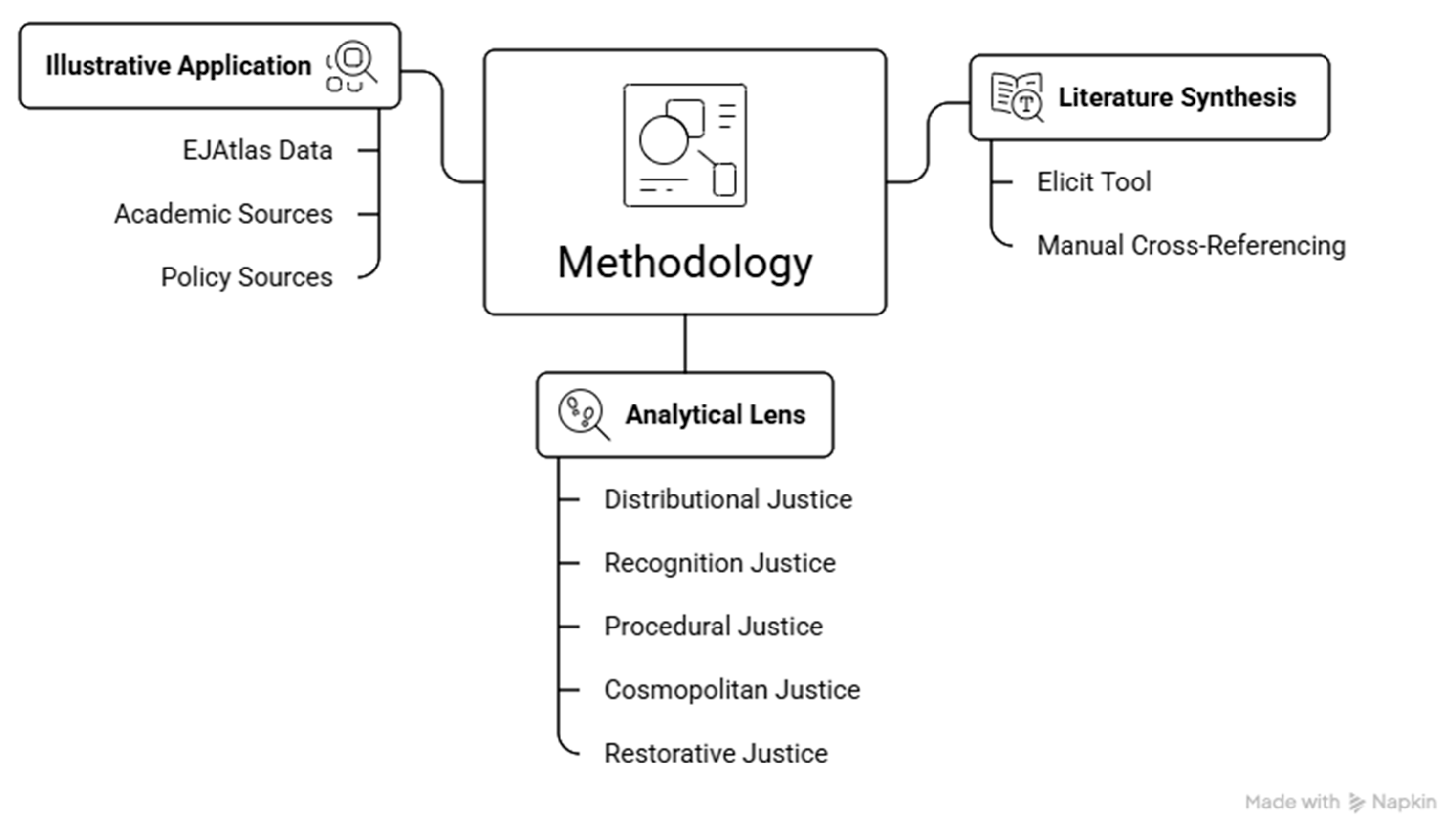 | Theoretical framework | Identify and extract the primary theoretical frameworks used in the study. Look for explicit mentions of: EJ framework, green extractivism, geopolitical metabolism, coloniality/postcolonial perspectives, Indigenous perspectives on ET. |