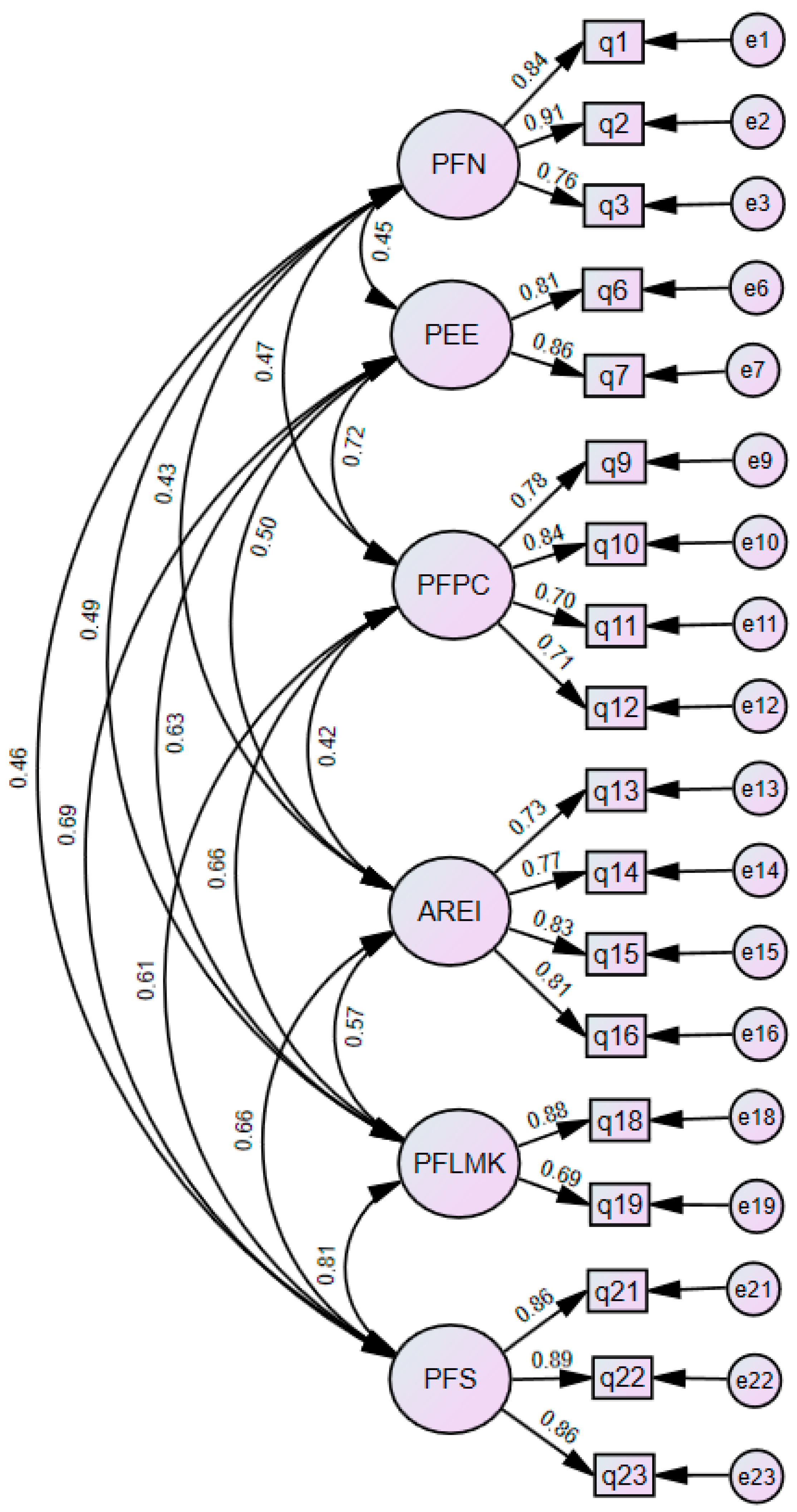 | Factor | Cronbach’s α | McDonald’s ω | AVE | PFN | PEE | PFPC | AREI | PFLMK | PFS |