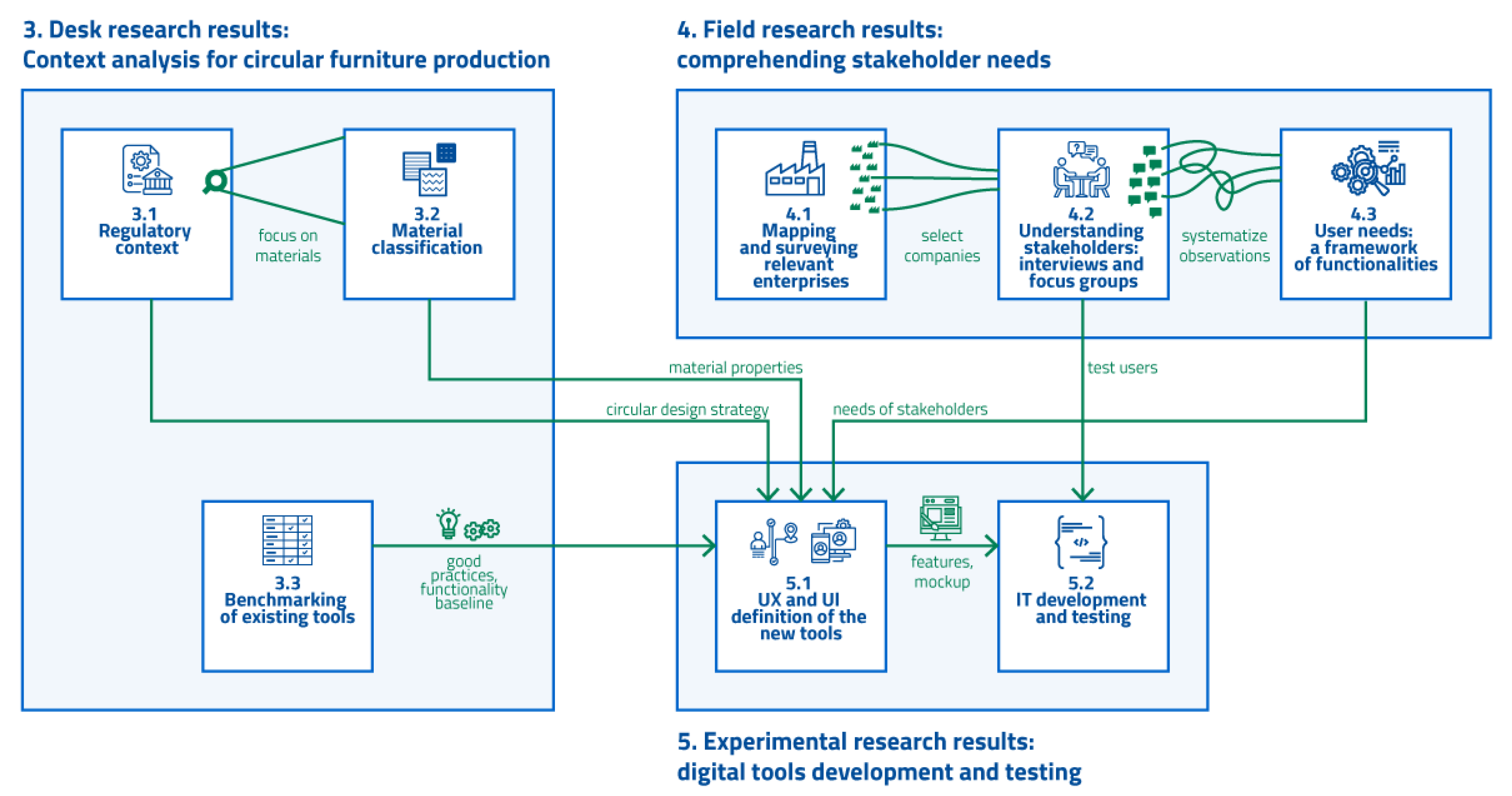In line with the outlined research aims, the mixed methodology includes both quantitative and qualitative analysis in order to understand relevant human and technological aspects, leading to a progressive definition and development of functionalities, which are evaluated in a final phase. Therefore, it was necessary to combine desk research, helping to understand the regulatory context as well as current tools and operational models for sustainable production, with field research to gather insights about the needs directly from the relevant stakeholders of the furniture ecosystem, and finally, experimental research to validate the relevance of the newly developed digital tools in a controlled environment. The paper’s sections after