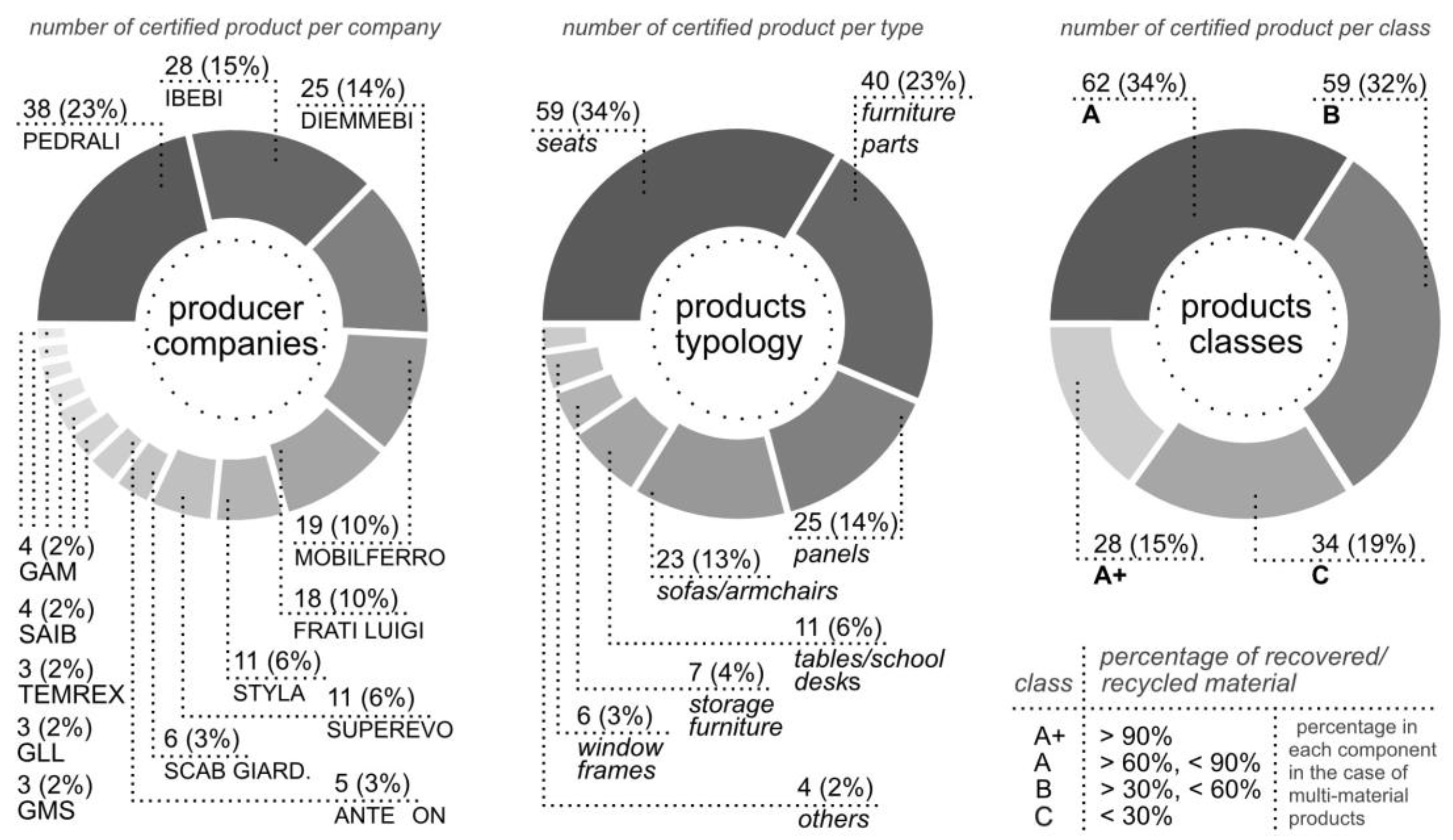 Figure 2). Of all the certified furniture products, 70% comes from five companies, indicating how only a few large companies have adopted the certification scheme with multiple products. Only 15% of certified products are classified as A+, meaning they contain more than 90% recycled content, such as the cabinet with doors by Mobilferro, which contains 90.1% recycled material.