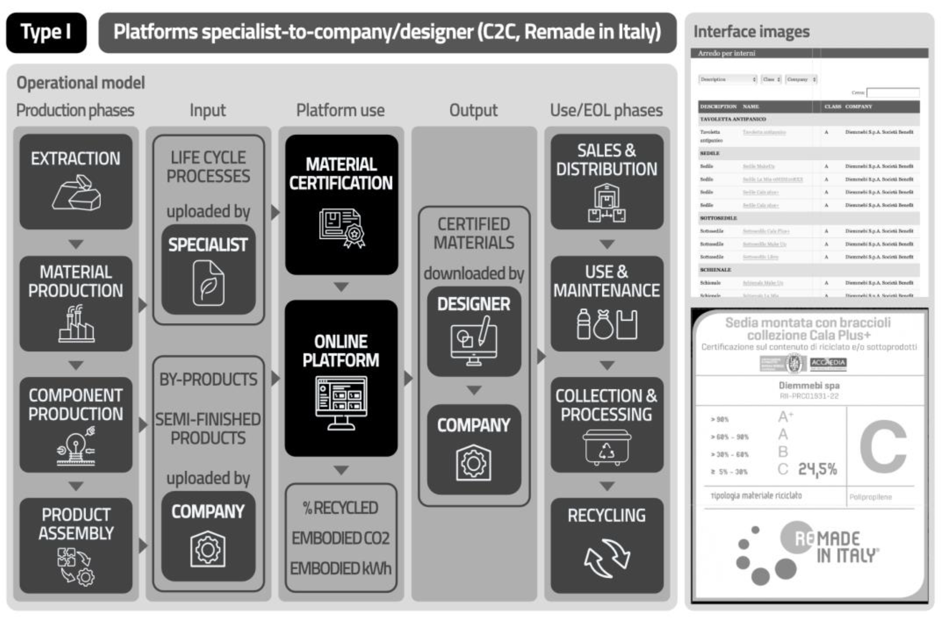 Figure 3) involves a certifying body that, through the figure of a specialist, uploads the certifications related to materials and the life cycle processes that affect them to the online platform; information about the certified materials is then available to manufacturers and designers. Part of this model is C2C Certified [