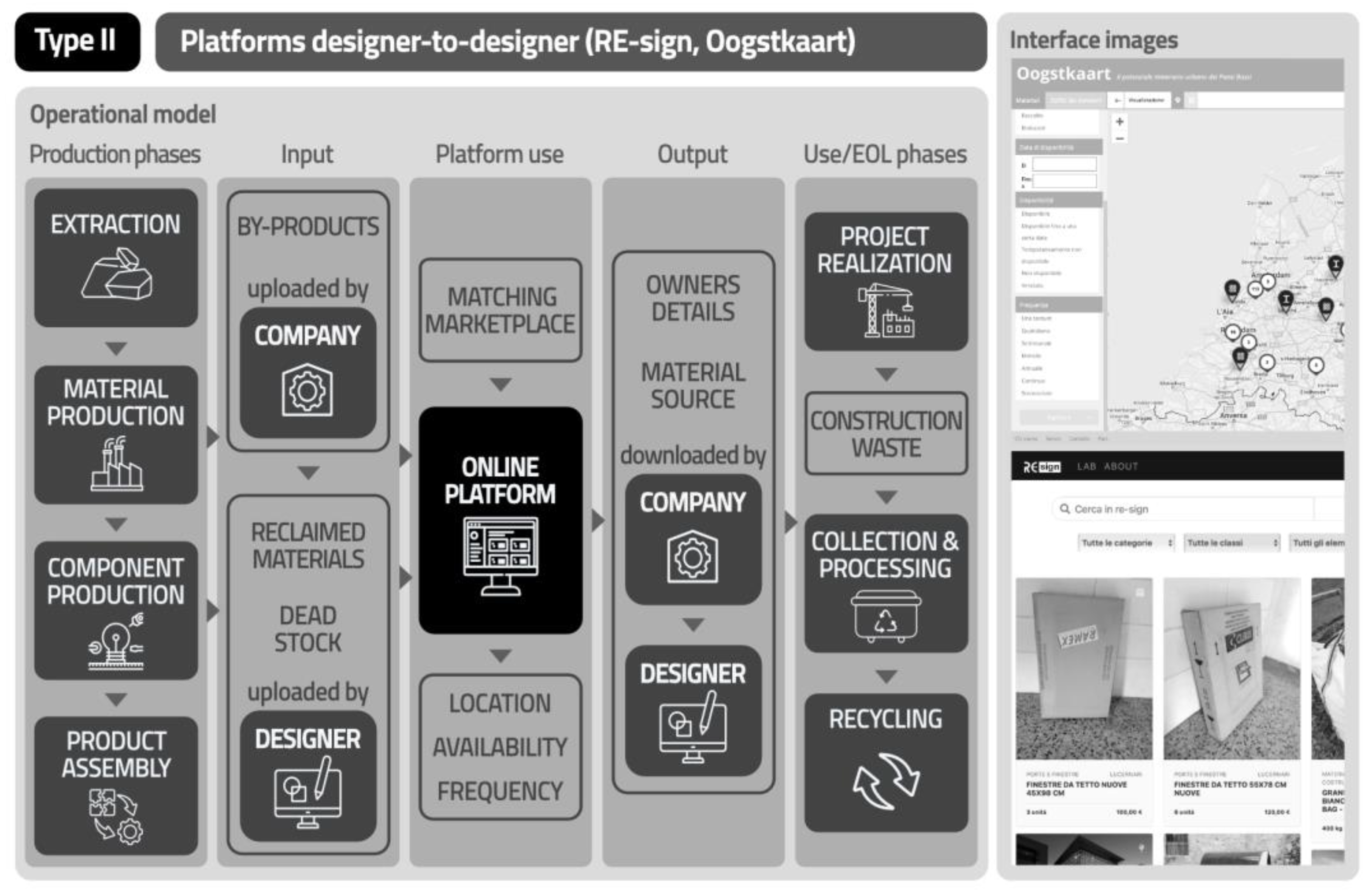 Figure 4) is based on the direct exchange of building materials between designers interacting at different stages of the construction process through an online platform based on the geographical location of available materials. In this way, surplus materials related to construction and demolition processes can be used for new operations through a recovery that takes place directly from storage and construction sites. Included in this model are Oogstkaart [