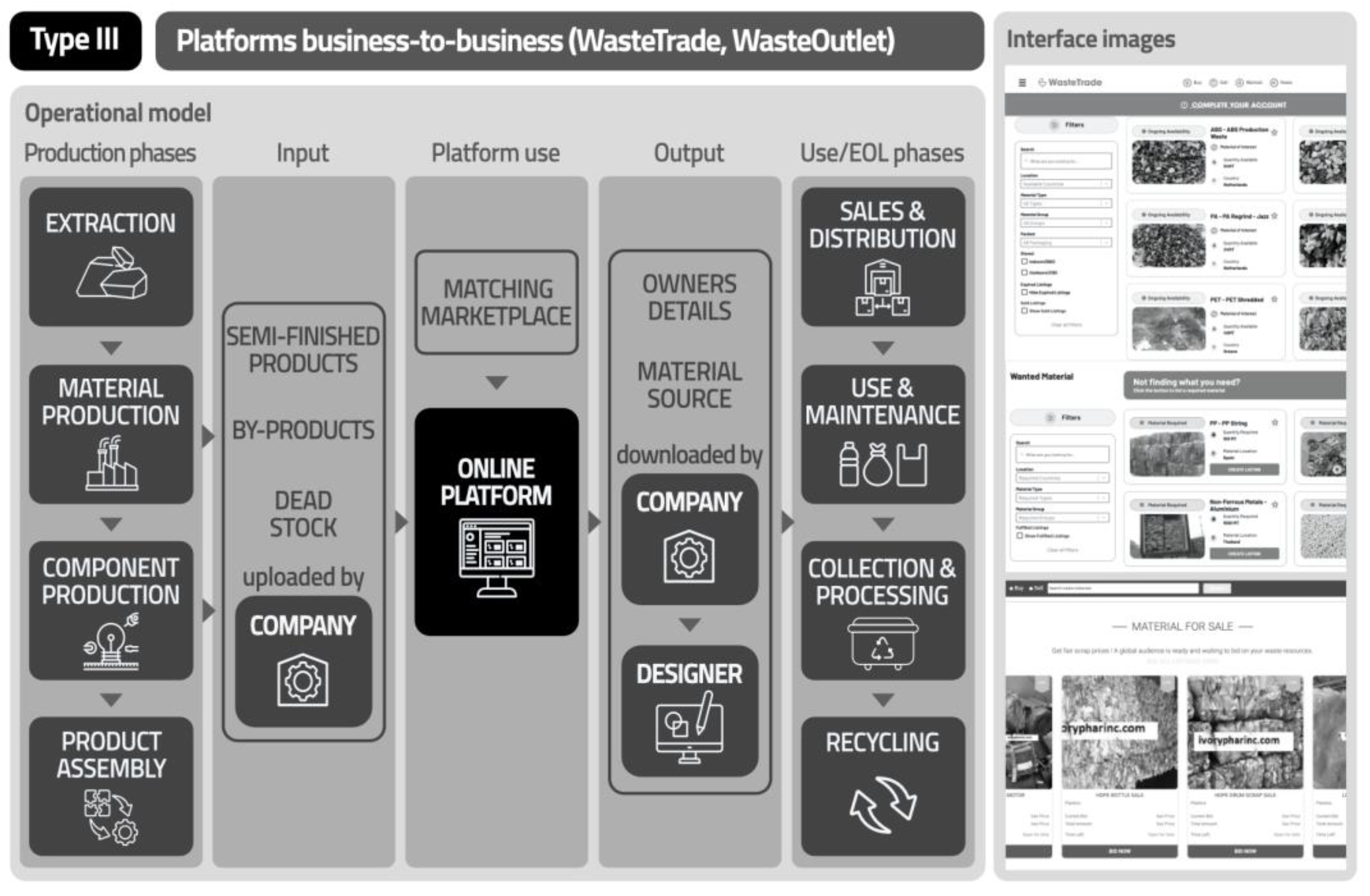 Figure 5) involves the exchange of semi-finished products, by-products, and scraps from different supply chains, facilitating communication between different manufacturers who interconnect in the input and output of data on materials for sale. Included in this model are WasteOutlet [