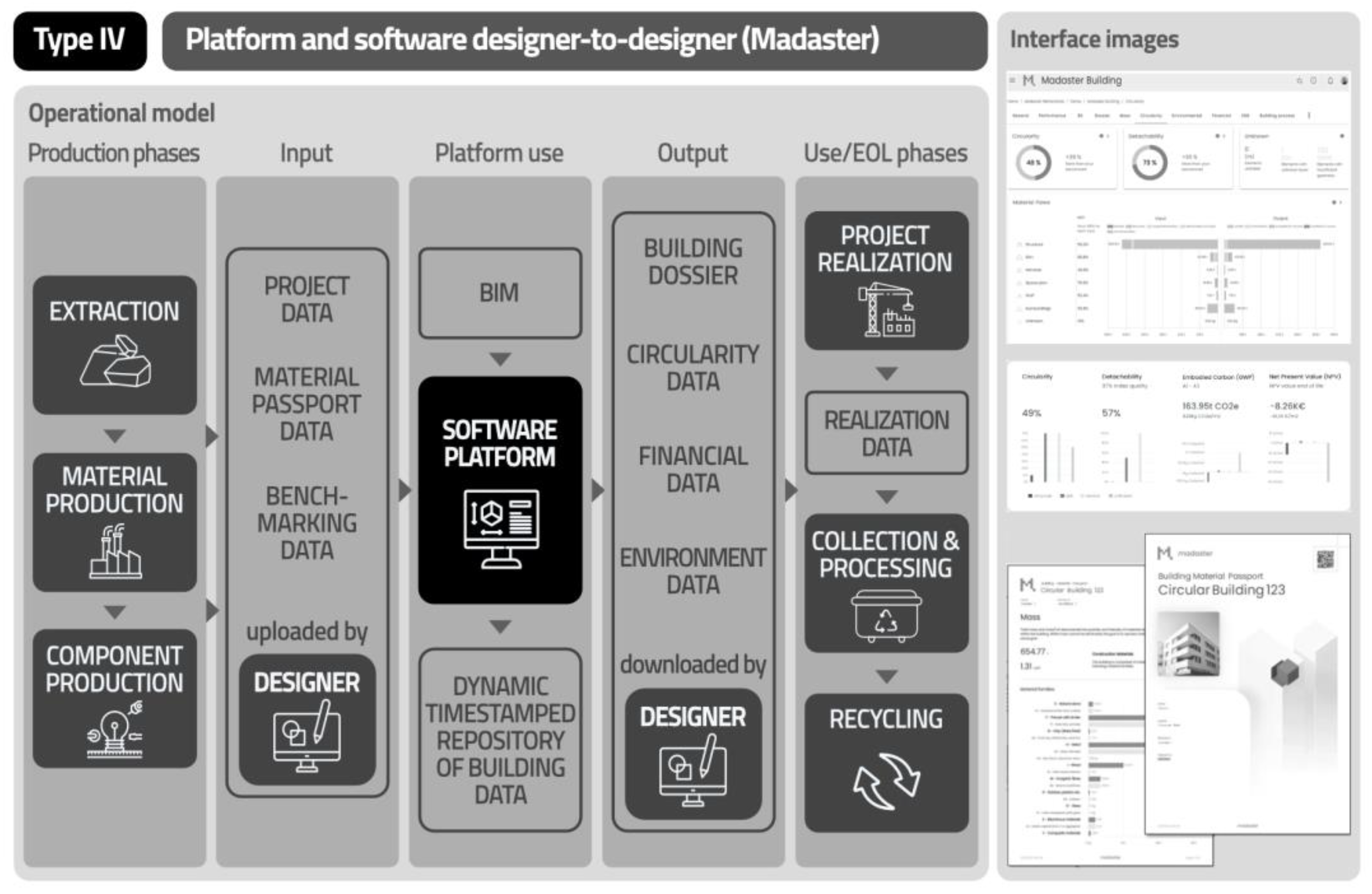 Figure 6) does not involve the exchange of goods between different parties but the support of the design process through integration of BIM software with a series of information related to the circularity and origin of building materials (project data, material passports); in this case, there is only one figure taking part in the process, as the data are uploaded and then processed by the designers themselves. The Madaster [