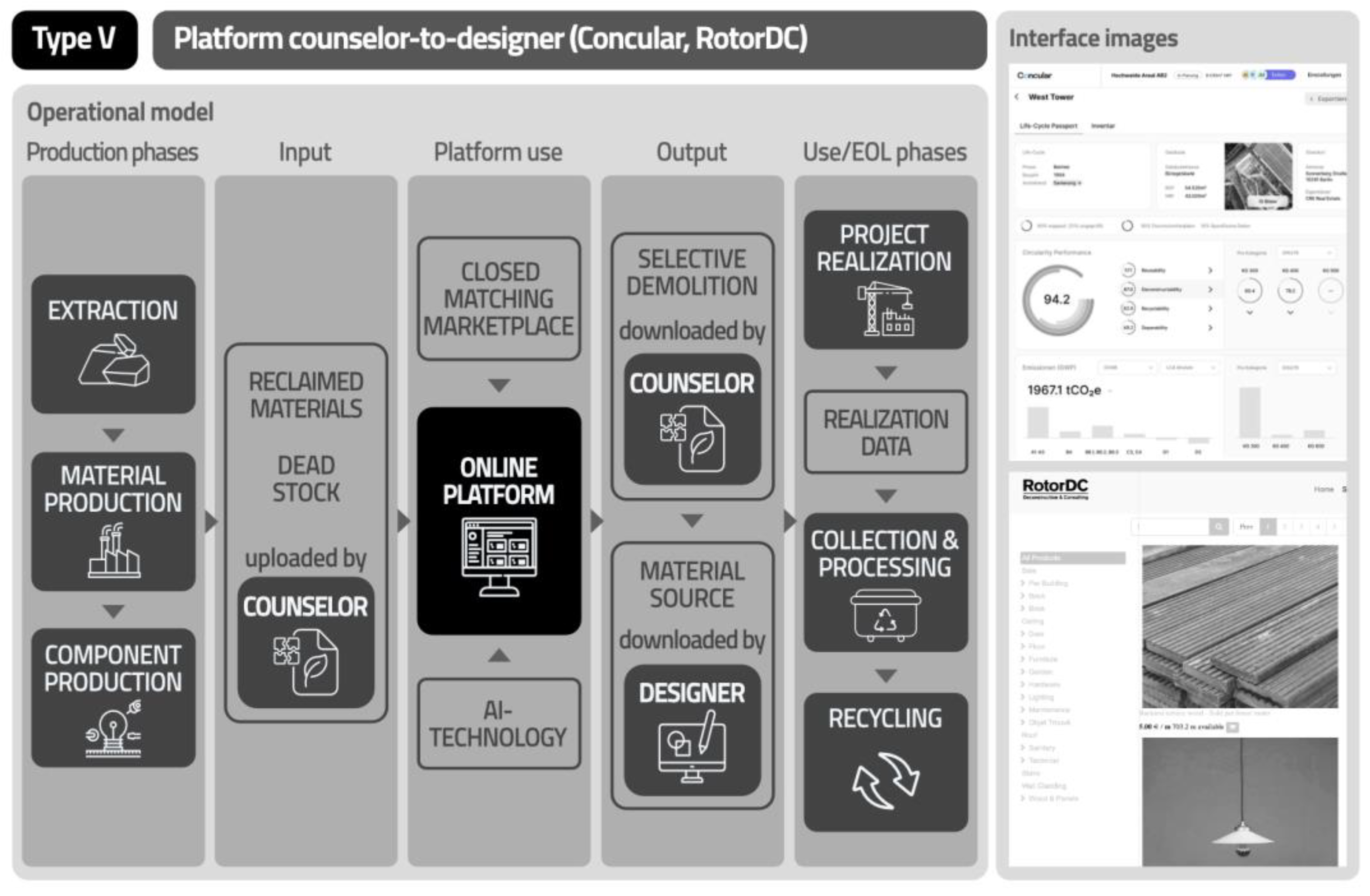 32] platform offers both a dedicated marketplace of circular building materials and support to the designer using AI technologies. The cooperative company RotorDC [