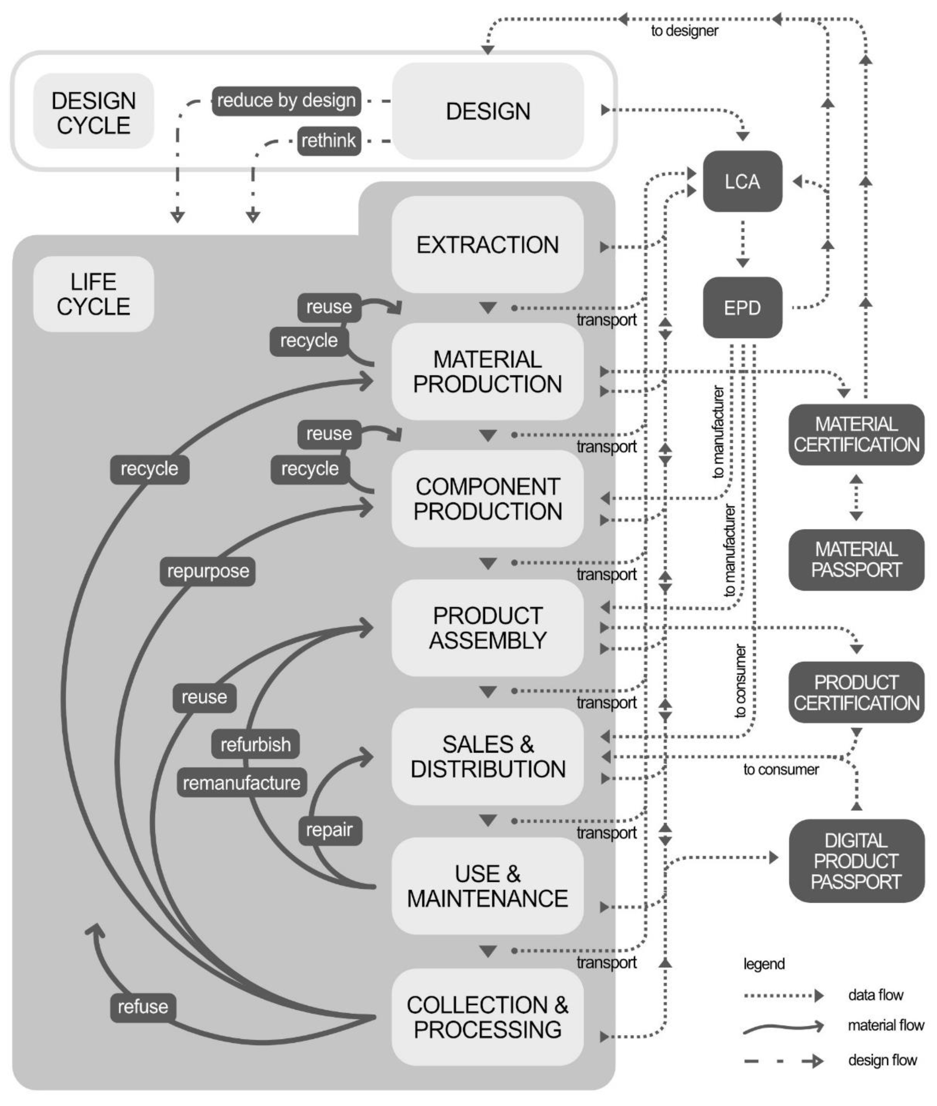 In this scenario, customers, be they businesses or consumers, need more detailed information about products and their sustainable characteristics, including life cycle environmental indicators. Public administrations need to access reliable documentation compliant with the GPP. This is provided through LCA studies, EPDs (based on LCA), and material and product certifications such as Digital Product Passports and Material Passports. All of these strategic documents collect information from different sources in different steps of the production process and product’s life cycle, including, for example, the waste/end-of-life management-related data. Data collection from each process thus entails an appropriate digital infrastructure and procedures ensuring traceability, and security.