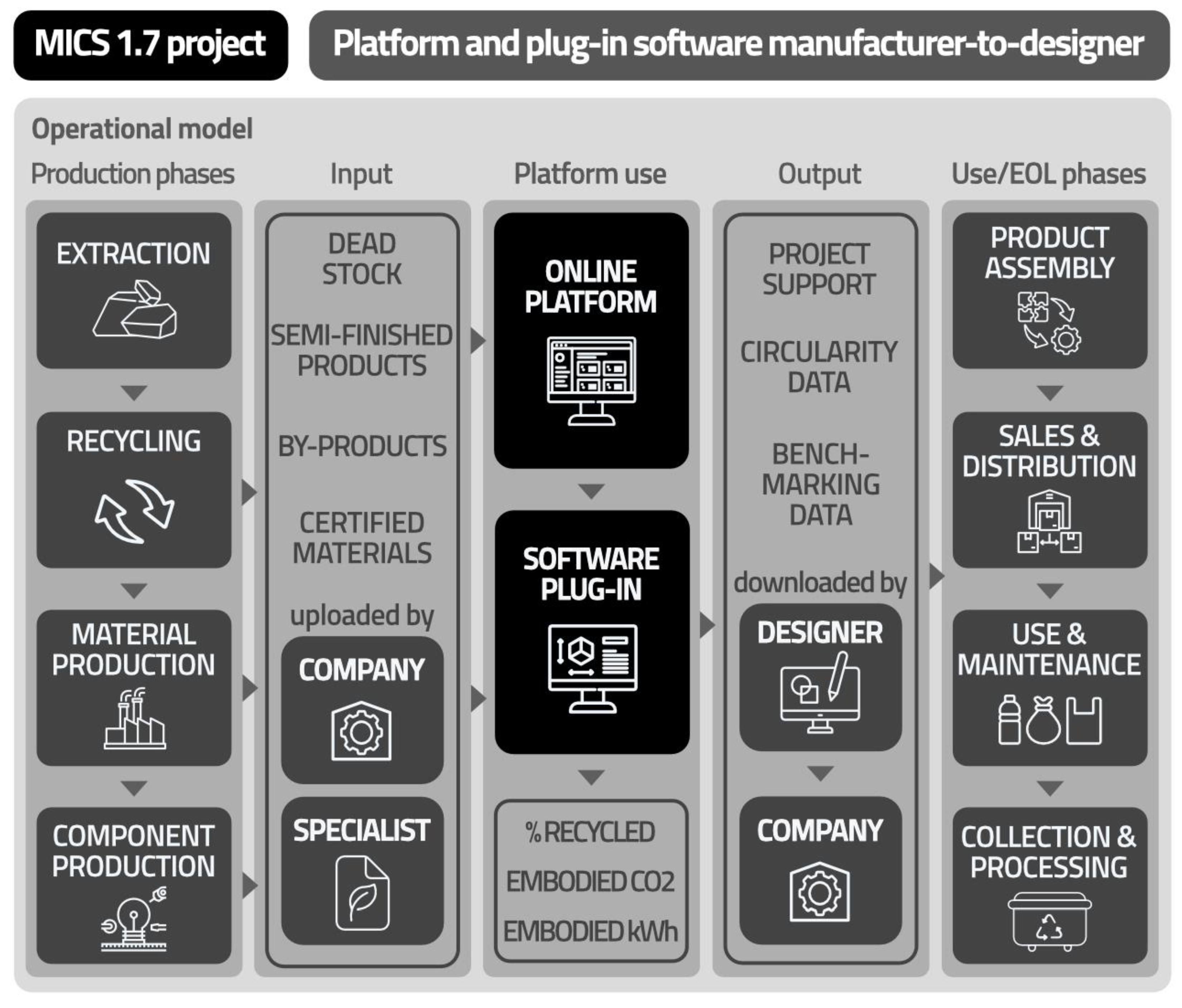 Section 3.1), which defines requirements, processes, and certification pathways, all of which determine possibilities for development. While acknowledging the complexity of flows and multiplicity of possible sustainability strategies, the project chose to limit the scope to the phases of material and component production, where a major integration of circular materials would be beneficial. Therefore, further focus of the initial desk research was on materials (