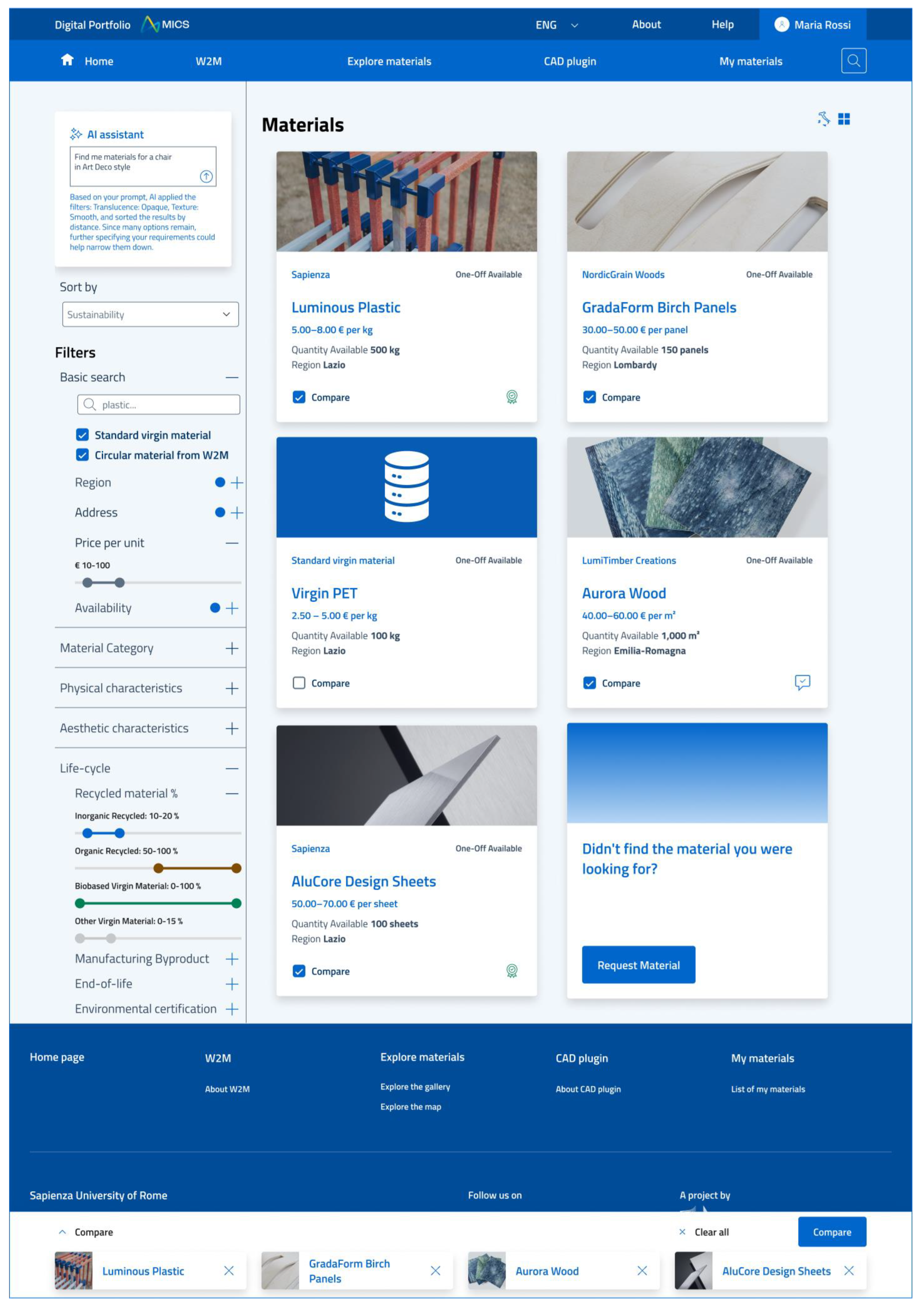 The usability testing with the three stakeholder categories confirmed the platform’s strong potential to support collaboration among designers, waste managers, and manufacturers. Participants reported a clear and coherent interface, efficient task performance, and valuable AI-assisted features, reflected in a high System Usability Scale score (80.9) and a positive Net Promoter Score (+16.7). Feedback emphasized the usefulness of material comparison and upload functions while suggesting richer data (e.g., delivery times, certificates) and improved visual integration with CAD tools. Despite limitations related to the brief simulated tasks and the mock-up status of the CAD plug-in, findings indicate promising usability and user acceptance of the prototype.