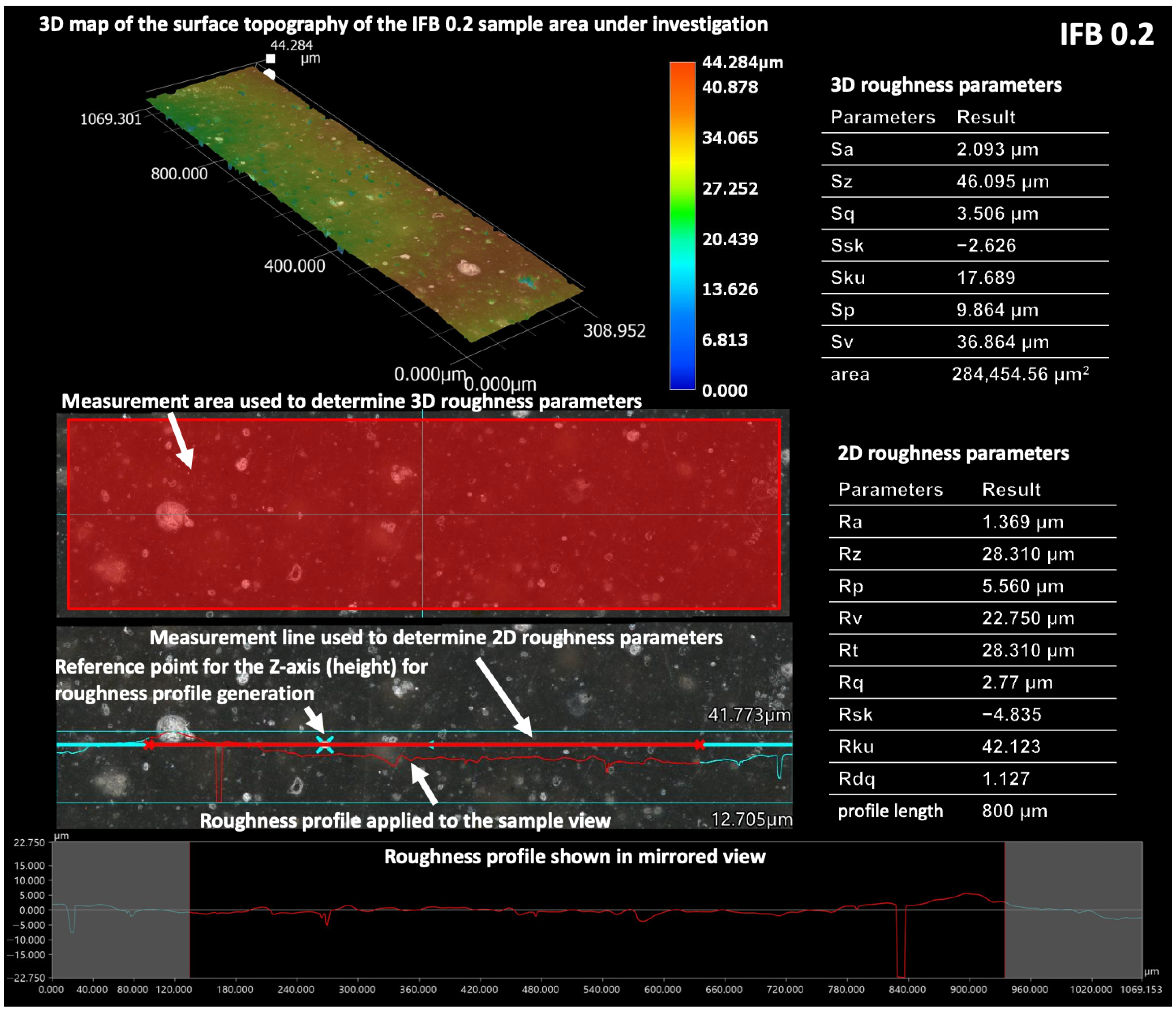 Figure 2 shows a three-dimensional (3D) surface height map of the analyzed sample area, where the color scale represents height variations across the surface. This visualization enables the identification of local surface features such as peaks, depressions, and defect clusters. The central part of the figure presents a two-dimensional (2D) image of the same surface region with the measurement area highlighted, from which the 3D roughness parameters were calculated. The evaluated areal roughness parameters (e.g., Sa, Sq, Sz, Ssk, Sku, Sp, Sv) are listed, providing a quantitative description of surface morphology over the entire measurement area. The lower part displays the measurement line used to determine traditional 2D roughness parameters, together with the corresponding roughness profile extracted along this line. The profile is shown in a mirrored view to clearly visualize height fluctuations and surface irregularities along the selected cross-section. It should be emphasized that, as demonstrated by Kowalski et al. [