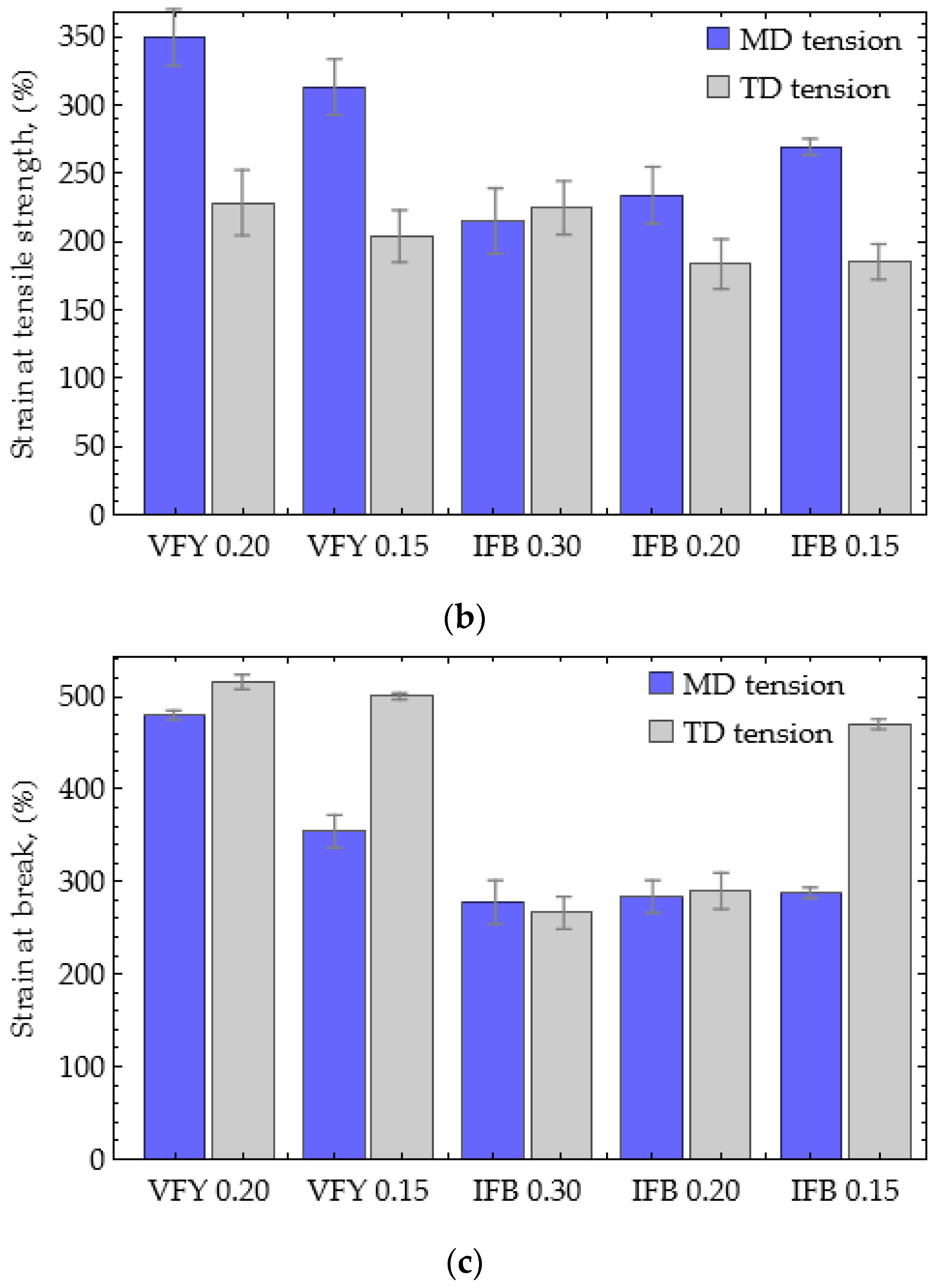 Figure 4b–c, the vapor-proof film VFY 0.20 exhibited average strain at tensile strength (STS) and strain at break (SB) in the MD of 349.44% and 479.88%, respectively, while in the transverse direction (TD), these values were 228.31% and 515.71%. On the other hand, the IFB 0.15 film showed average strain at tensile strength (STS) and strain at break (SB) in the MD of 269.17% and 287.74%, and in the TD, these values were 184.98% and 469.96%.