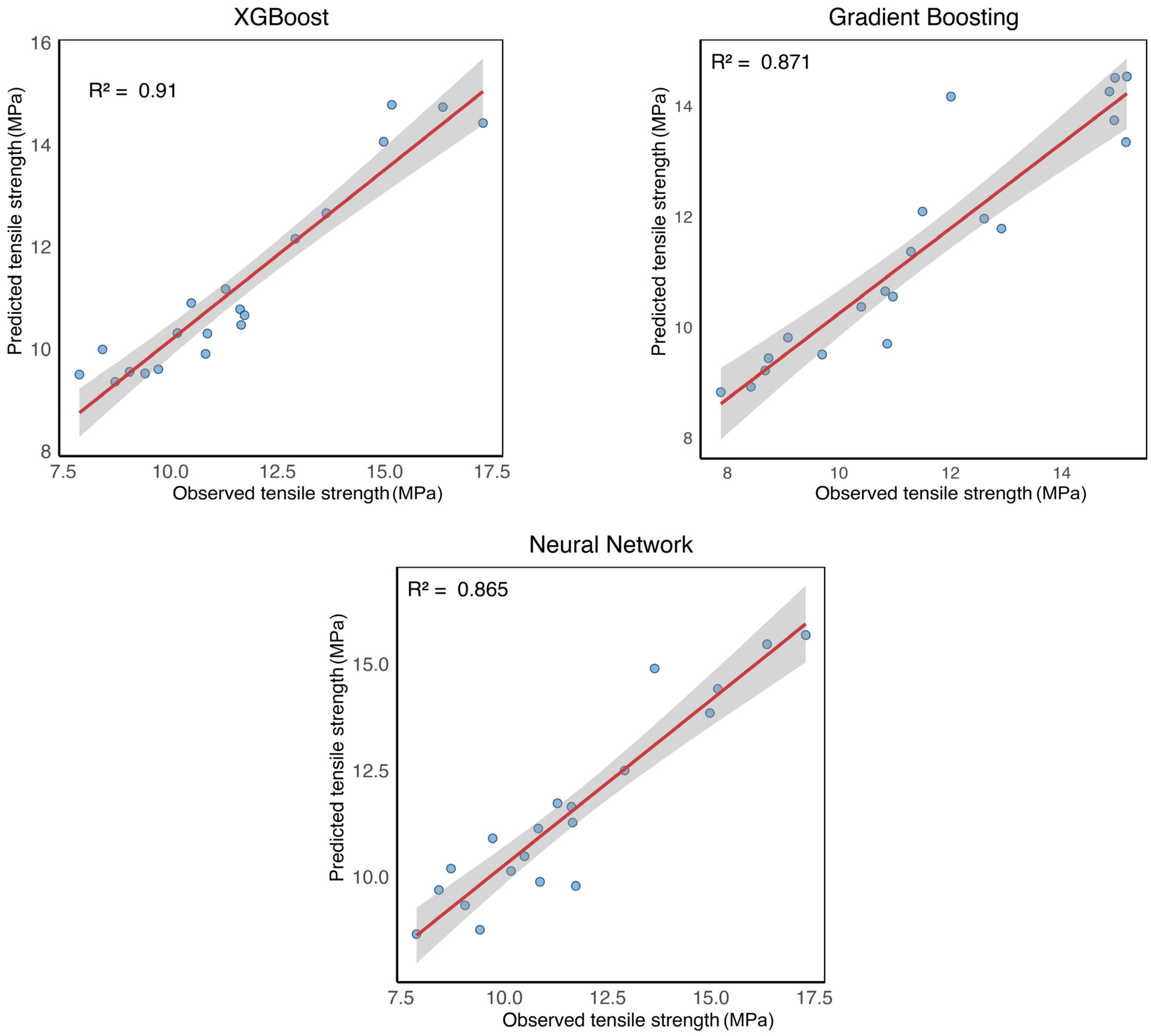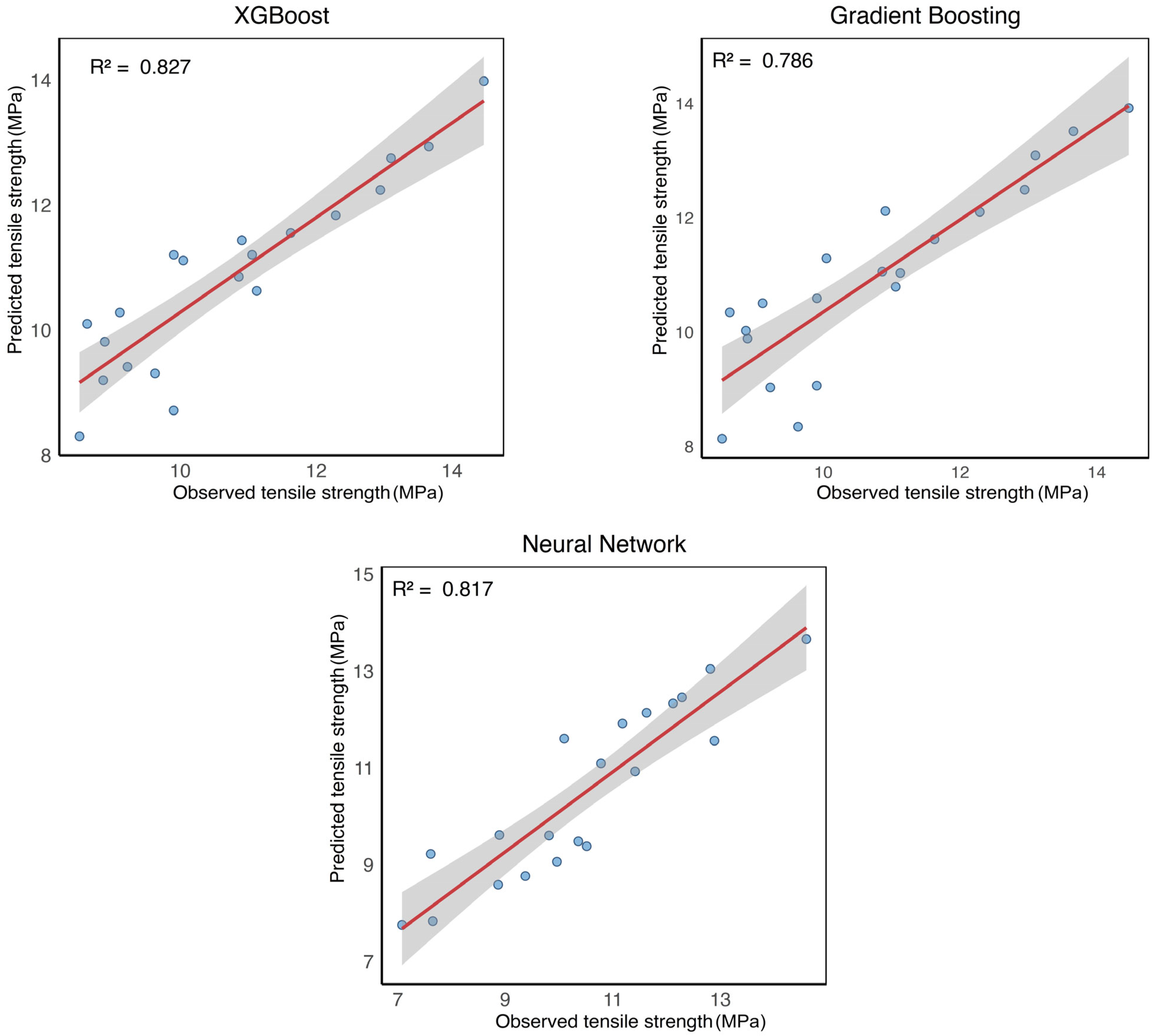 Figure 5), all models exhibit a clear positive correlation between predicted and observed tensile strength values. XGBoost shows the tightest clustering of data points around the regression line, consistent with its superior quantitative performance reported in