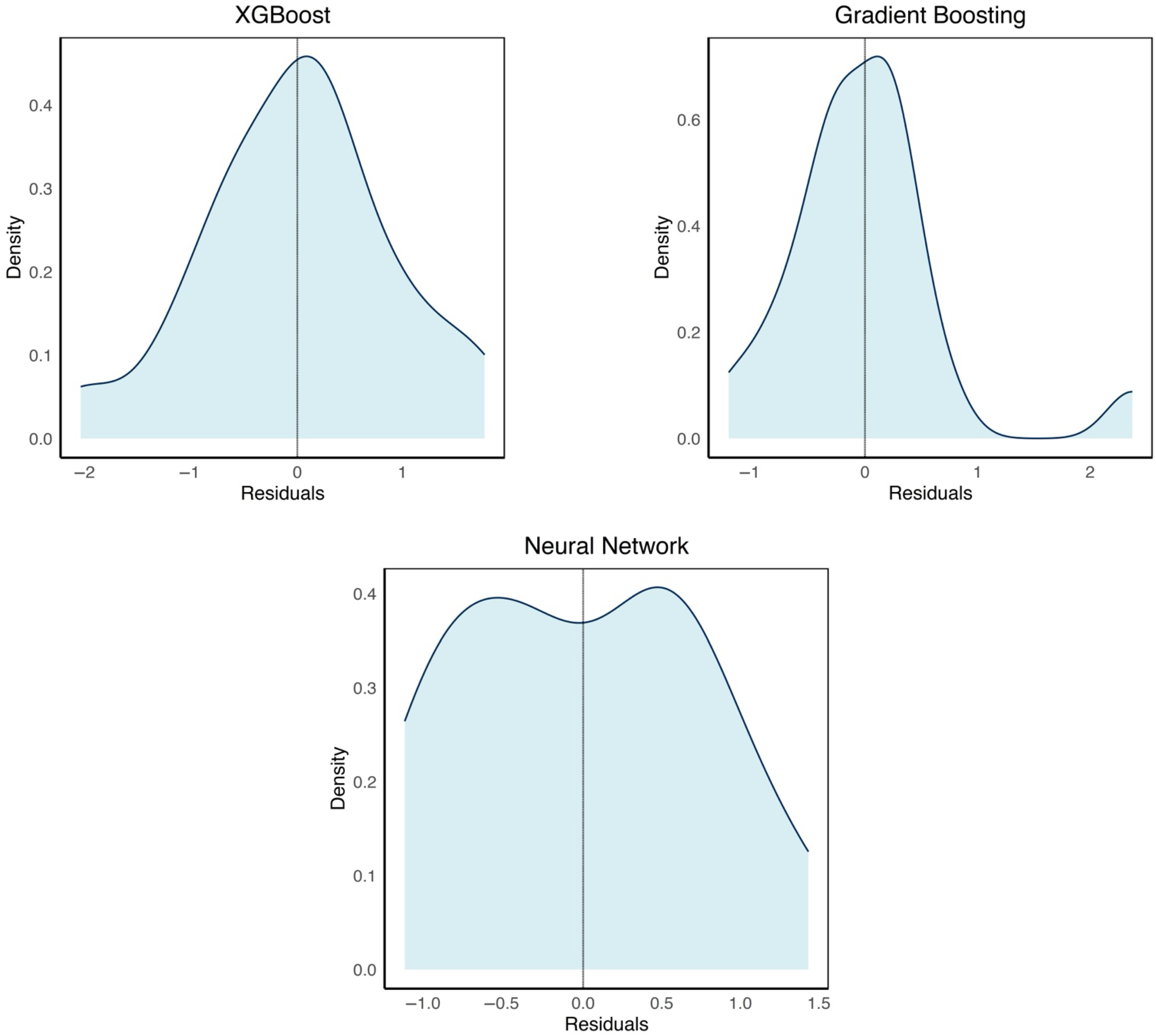 Figure 8 present the residual distributions for three models, XGBoost, Gradient Boosting, and Neural Network, across two datasets (for the transverse direction (TD) (