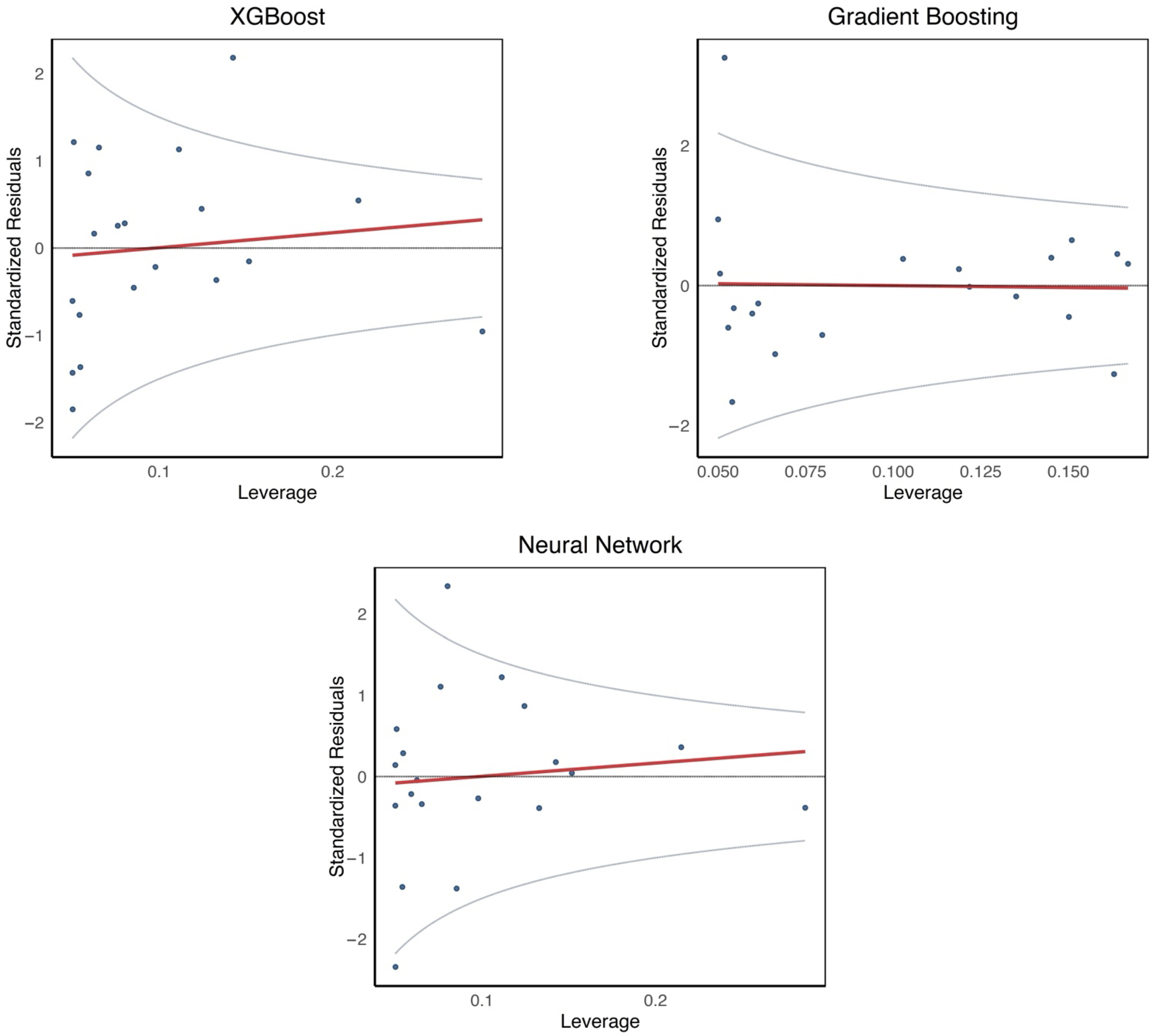 Figure 10 illustrate the relationship between standardized residuals and leverage for the analyzed algorithms. The relationship between residuals and leverage can indicate the presence of outliers or systematic errors in the models. These charts are often used to assess the stability and quality of models. The chart shows a random distribution of points across leverage values, suggesting that the XGBoost model performs well in the transverse direction (TD). The absence of noticeable patterns implies a lack of systematic errors and relatively good model stability. In the case of Gradient Boosting, the chart is similar to that of XGBoost, with points evenly distributed around the axis. No discernible trend indicates that Gradient Boosting in TD also does not exhibit significant systematic errors. However, a few points with higher leverage values are visible and may be more influential. The leverage chart for the neural network shows no clear trends in residuals, although a few outliers with higher leverage values suggest the potential presence of influential points.