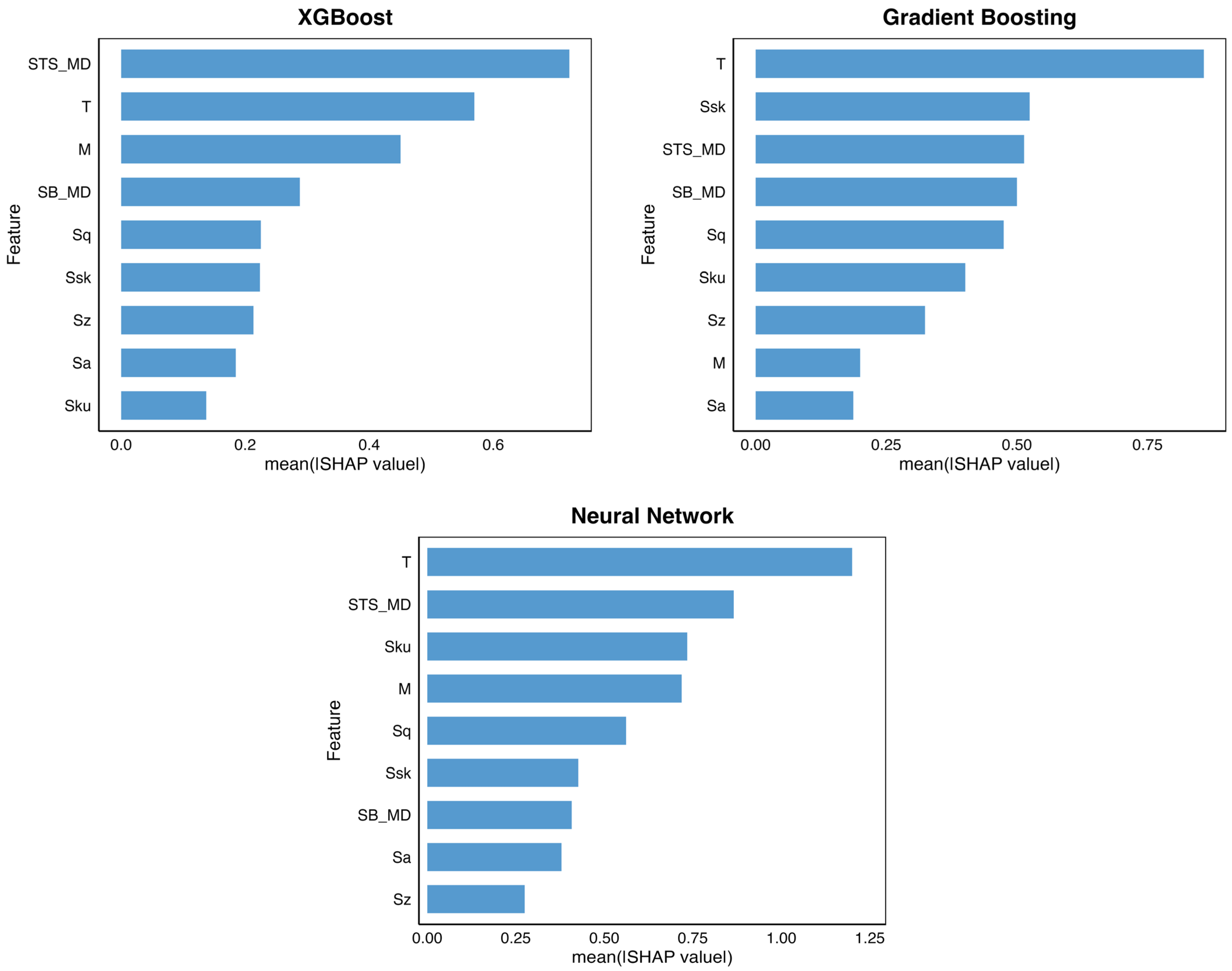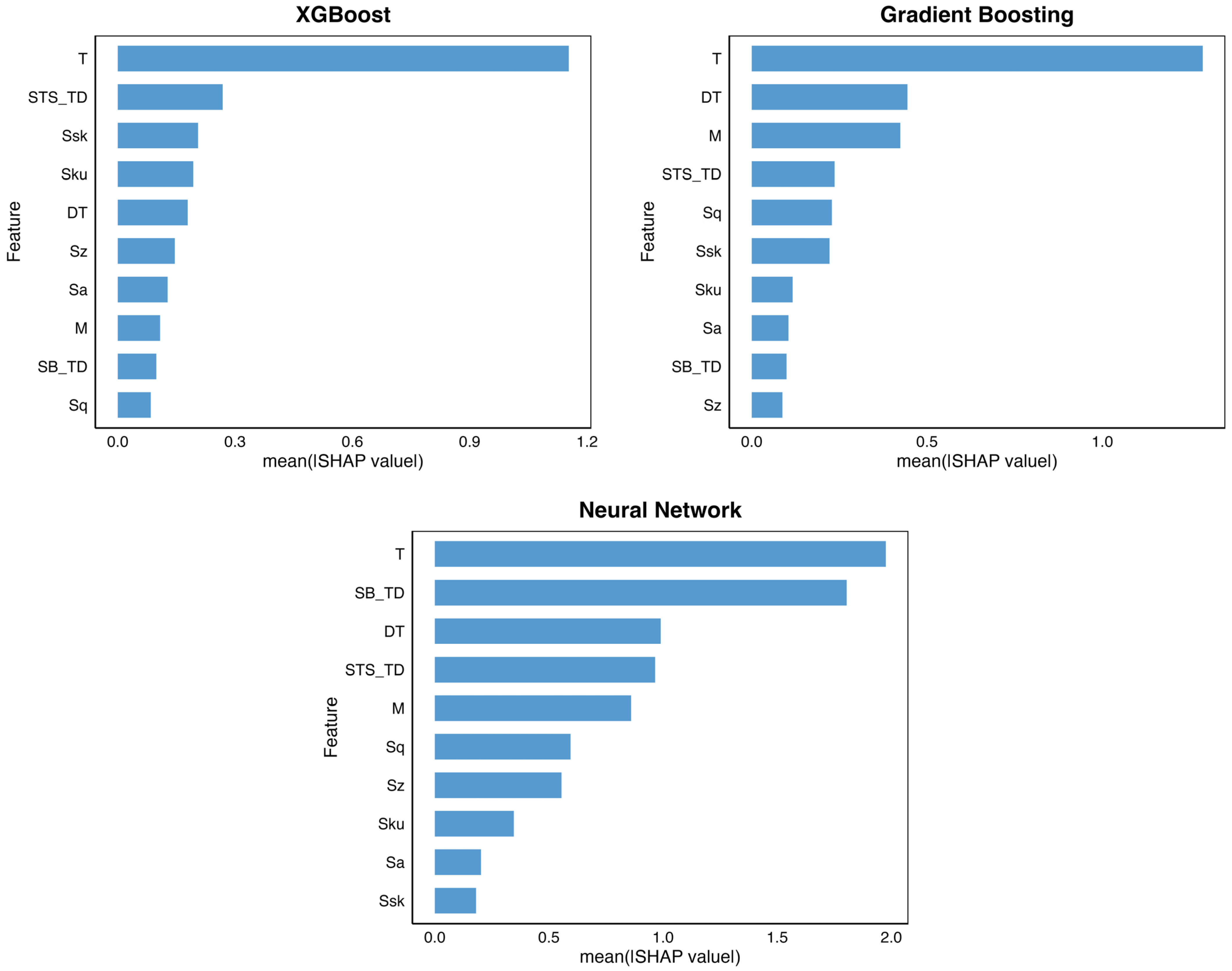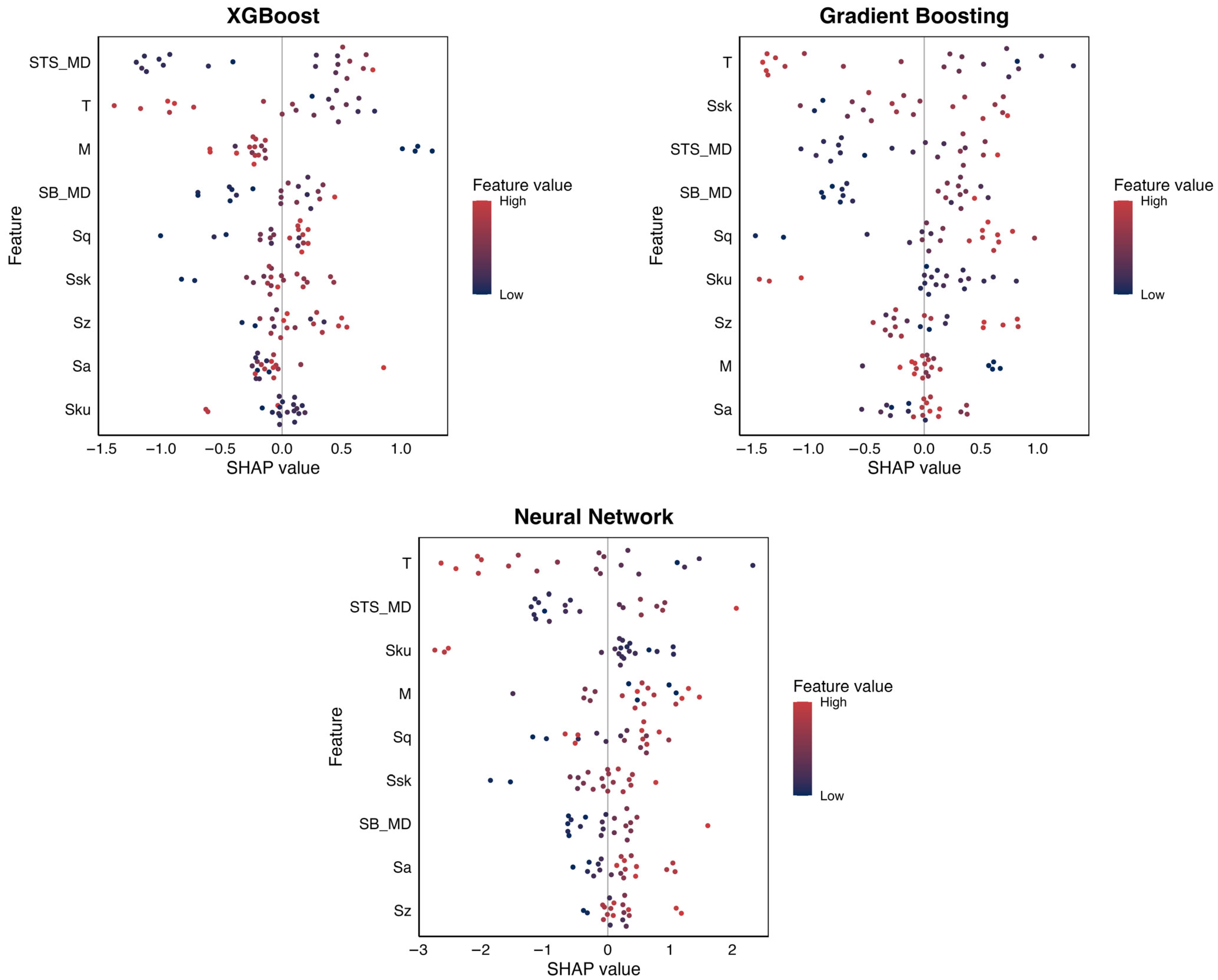 Gradient Boosting places strong emphasis on thickness and selected roughness and strength-related parameters, distributing importance more evenly than XGBoost but still prioritizing physically interpretable features. The Neural Network exhibits a similar distributed attribution pattern as observed in TD. However, the beeswarm plot (