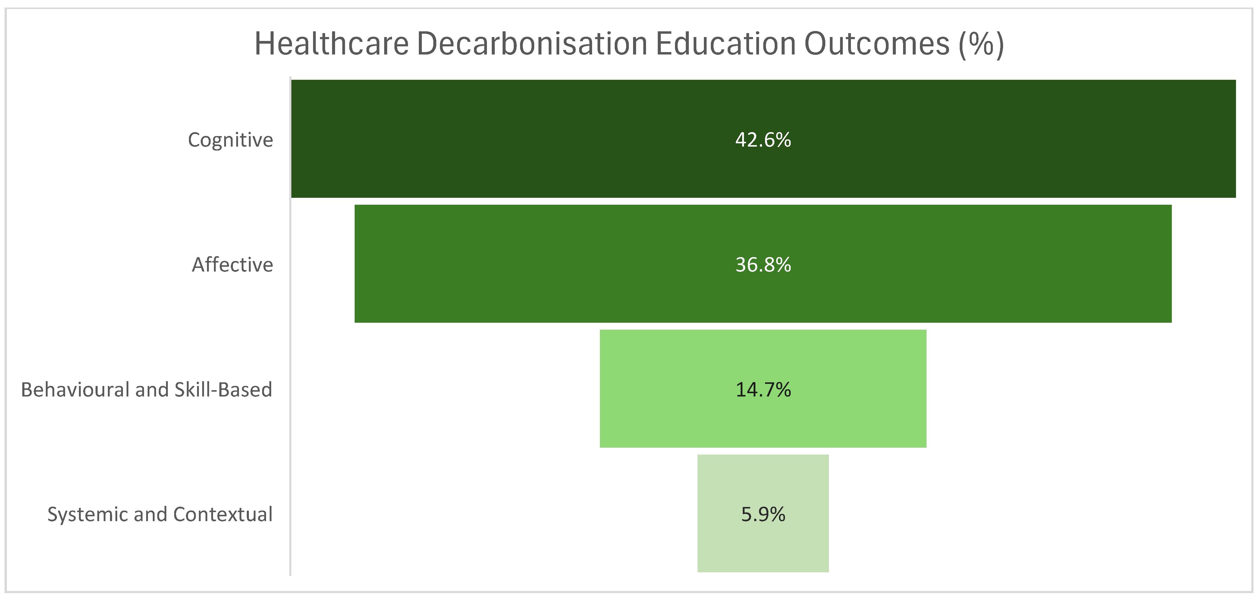 | 1. Building a Decarbonisation Mindset | Improved knowledge, awareness, and understanding of healthcare decarbonisation; recognition of climate–health-professional practice link; reframing decarbonisation as professional responsibility | Identification of carbon-intensive practices (anaesthetic gases, PPE, procurement) Self-reported awareness of system-level drivers | Scenario-based learning Augmented reality Planetary health modules Simulation Quality improvement projects Practical relevance enhances intrinsic motivation |