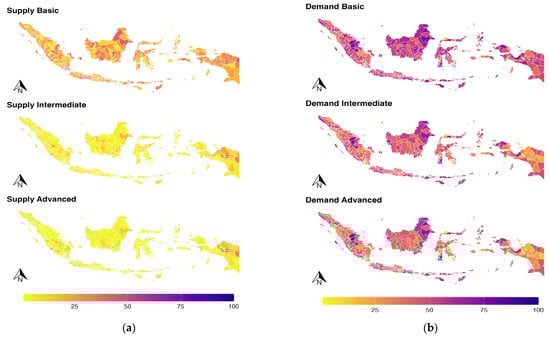 Spatial distribution of digital skill (a) supply and (b) demand.