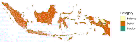 where denotes the supply–demand ratio for region i, represents the average level digital skill supply across the basic, intermediate, and advance category, and represents the corresponding level of digital skills demand. The terms and indicate the maximum values of supply and demand observed across all districts. This formulation is adapted from the Ecosystem Service Supply–Demand Ratio proposed by [17]. The interpretation of the Digital Skills Supply–Demand Ratio (DSSDR) is straightforward. A positive value () indicates a surplus, meaning that the supply of digital skills in region i exceeds the level of demand. Conversely, a negative value () reflects a deficit, implying a shortage of digital skills relative to regional demand. Values close to zero () suggest a state of balance, where the supply of digital skills is broadly aligned with local labor market requirements. The DSSDR used in this study is a task-based, exposure-and-capability indicator derived from IMDI, rather than a direct performance-based proficiency measure, and thus reflects regional patterns of engagement in digital tasks instead of test-based skill scores.