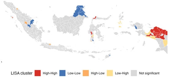 In the SDM, the dependent variable is the DSSDR, with positive values signifying a surplus of digital skills and negative values indicating a shortfall. Most explanatory variables are quantified as percentages, but GRDP per capita is represented in millions. The intercept is negative and statistically significant (−33.704, p = 0.016), indicating that, when all factors are maintained at their baseline levels, Indonesian regions inherently exhibit a deficiency in digital skills. At the local level, none of the factors has a statistically significant influence at the 5% threshold. The lack of statistically significant local impacts should not be construed as evidence of the insignificance of these factors. This pattern likely indicates dynamic adjustments and time-lag mechanisms, where enhancements in digital infrastructure, education, and institutional capacity gradually influence the equilibrium between the supply and demand for digital skills. In practice, investments in connectivity, education, or ICT initiatives necessitate time to convert into worker skills and labor market alignment. The current study utilizes cross-sectional data, which only reflects simultaneous relationships and cannot clearly predict delayed effects. Future research employing panel or dynamic geographical models is necessary to officially investigate the temporal adjustment mechanism behind regional digital skill disparities.
