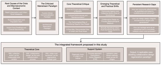 Consequently, an integrated operational framework is required: (1) operationalise community collective action as a measurable core variable; (2) position collaborative design as the central mediating process transforming agency into outcomes (spatial, economic, and cultural); (3) explicitly link the regeneration of specific heritage assets (e.g., cave dwellings) to strategic objectives for fostering urban-rural symbiosis, while providing diagnostic conditions and pathways to evaluate and advance these goals. The proposed “Collaborative Design for Regenerative Transformation” framework, integrating the Yaodong Living Heritage Sensitivity Index and Heritage Continuity Index, delivers precisely such a tailored solution meeting these requirements. This framework aims to transcend conceptualisation by offering a replicable model to transform vulnerable yaodong into community resilience and a dynamic force supporting regional sustainable development. The conceptual framework for the literature review is shown in Figure 2.