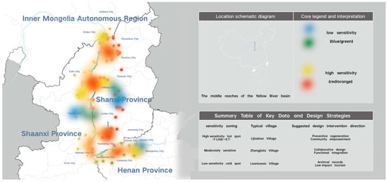 The Cave Dwelling Living Heritage Sensitivity Index applied across 30 villages yielded a spectrum of varying indices (range: 0.32–0.88, mean = 0.61, standard deviation = 0.14), serving as the basis for allocating design resources. Spatial hotspot analysis transformed the index into a usable design opportunity map, in Figure 5. Near the centre-east of prefecture-level cities like Lüliang, the sensitivity index revealed a cluster of villages with high Y-LHSI–termed “high-sensitivity hotspots”. High Y-LHSI correlates strongly with proximity to urban centres (r = 0.75, p < 0.001), indicating high pressure on these villages from population outflow. However, these villages also possess exceptionally high heritage density. This hotspot represents a priority area for preventative and regenerative design—only proactive measures can avert irreversible loss, while leveraging proximity to urban markets enables reuse.