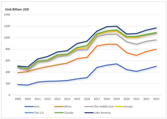 Regional Distribution of International Business Revenue for Chinese ENR Top 225 Contractors from 2009 to 2023. Data Source: Engineering News-Record (ENR), United States, from 2009 to 2023. Unit: Billion (USD).