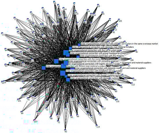 The nodes labeled 1–117 signify the 117 participants in the survey research. The red nodes represent different stakeholders, with the size of each node indicating its betweenness centrality and degree of influence, the spatial arrangement reflecting their relative importance, and the distance between nodes denoting their similarity. The survey data on inter-organizational links was evaluated using social network analysis to examine the network relationships between the general contractor and stakeholder organizations, resulting in the stakeholder inter-organizational relationship network illustrated in Figure 4.
