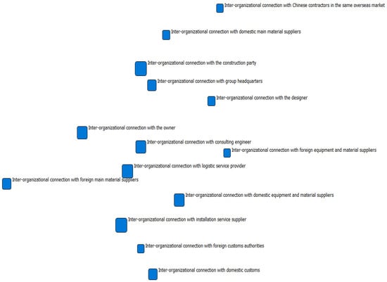 Furthermore, as seen in Figure 5, the inter-organizational relationships between the general contractor and the group headquarters/domestic equipment suppliers, together with the construction party/domestic primary material suppliers, exhibit notable similarity. This suggests that individuals tasked with sustaining relationships with diverse stakeholders exhibit a considerable degree of resemblance. This discovery may assist the general contractor in refining the internal organizational framework and personnel distribution to improve the efficiency of organizational structures and business operations.