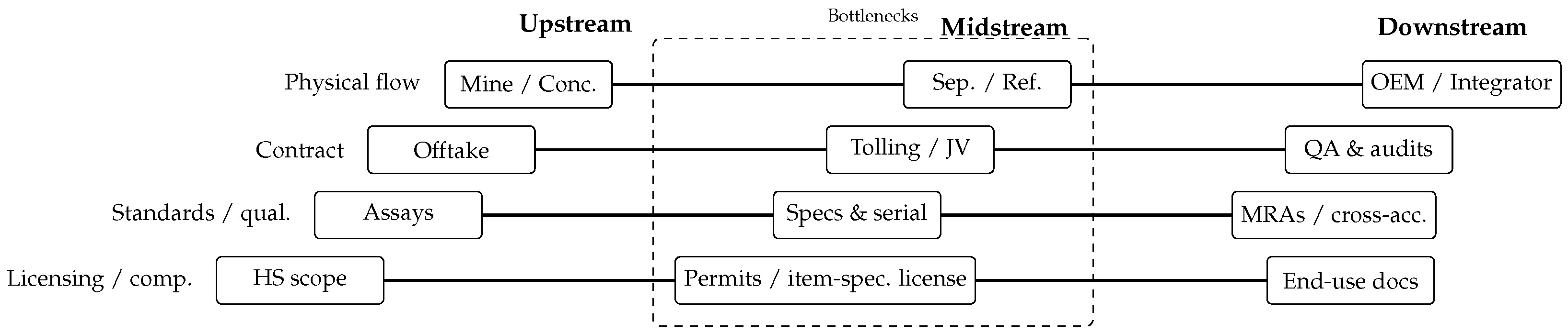 Across the three cases, the cooperation-first logic advanced in this manuscript is most directly supported by instruments that make qualified capacity portable and schedulable: clear criticality taxonomies that coordinate investment priorities, permitting and project-designation pathways that compress time-to-build, and licensing regimes whose published scopes and documentation requirements reduce uncertainty for compliant trade. In practical terms, these cases motivate the paper’s emphasis on standard interoperability and mutual recognition, predictable licensing scopes, and qualification-aware contracting as the fastest levers to expand feasible multi-layer routes through midstream bottlenecks without requiring wholesale duplication of entire supply chains [