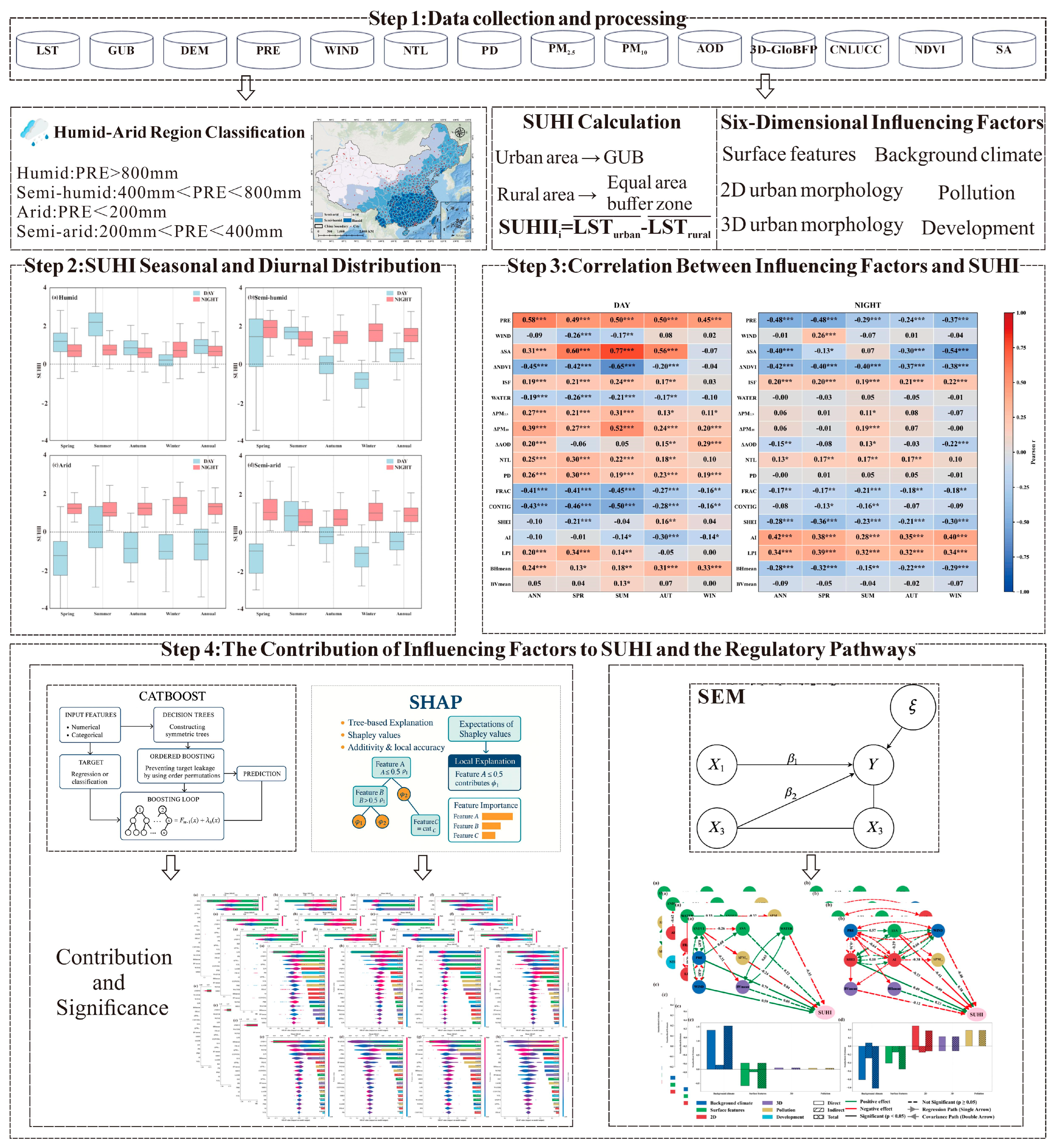 - What are the pathways through which these factors affect SUHIs across humid–arid regions?