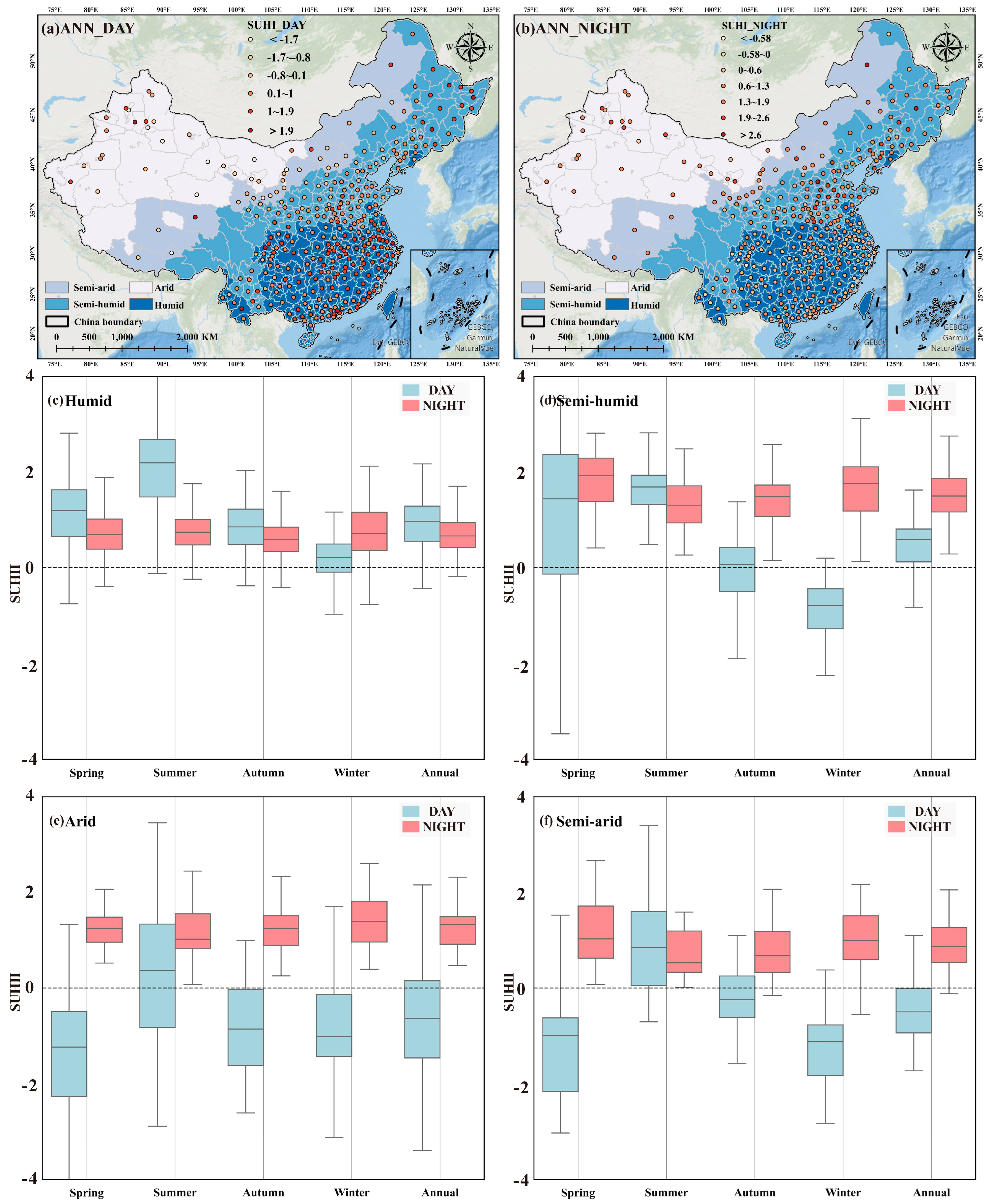 - SUHI Seasonal and Diurnal Distribution. Based on the humid–arid region classification, 329 cities from different regions were selected. The SUHII of these cities was calculated to explore the distribution characteristics of SUHII across different seasons and day/night periods. The analysis of SUHI changes across humid–arid regions revealed regional differences in seasonal variations and diurnal distribution.