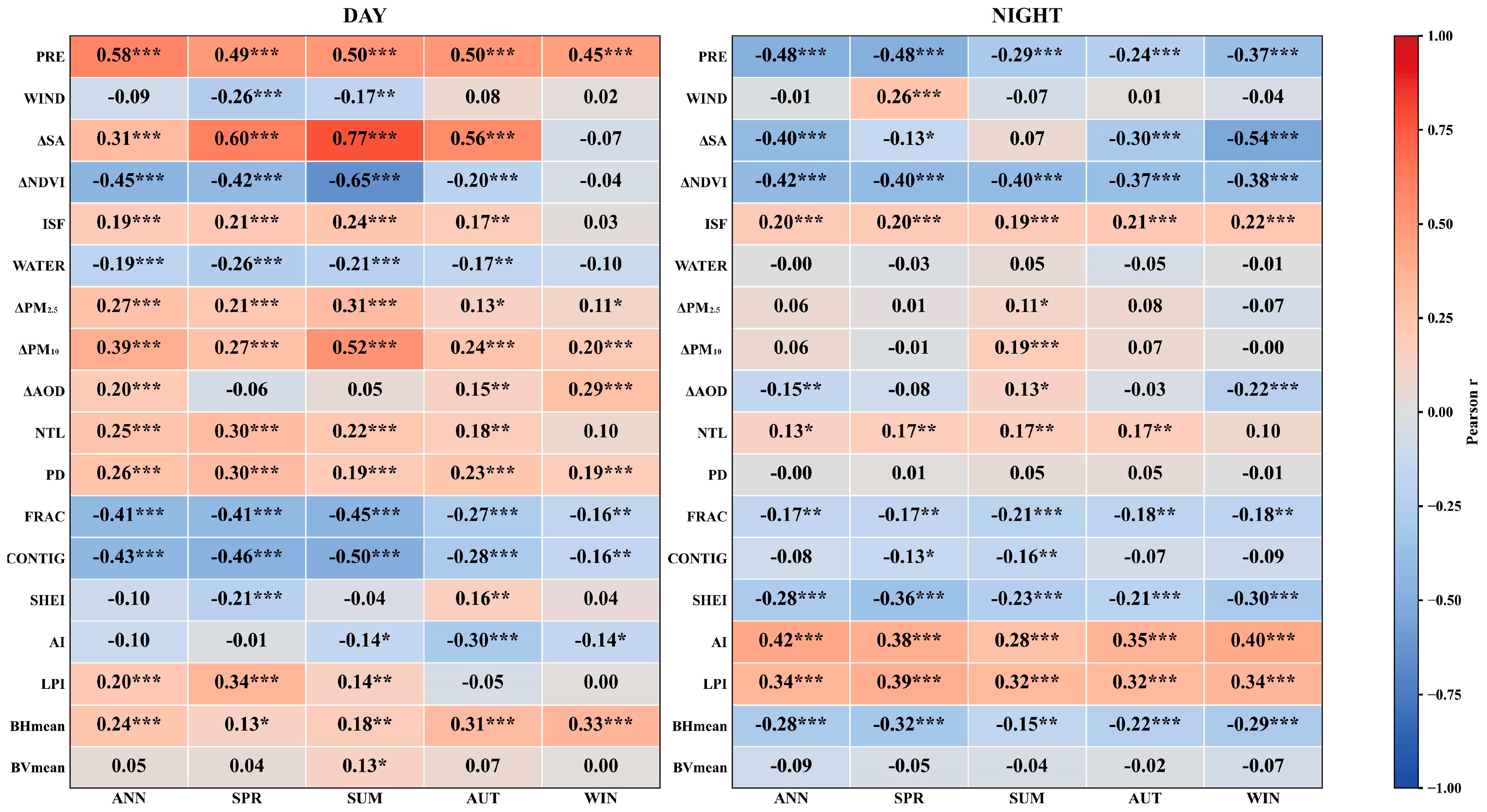 - Correction Between Influencing Factors and SUHI. Based on the six-dimensional influencing factors and calculated SUHII, the correlations between these factors and SUHII across different seasons and day/night periods in different humid–arid regions were analyzed. This correlation analysis provides an initial, region-specific overview of the relationships between individual factors and SUHII and offers a preliminary basis for subsequent multivariate interpretation.