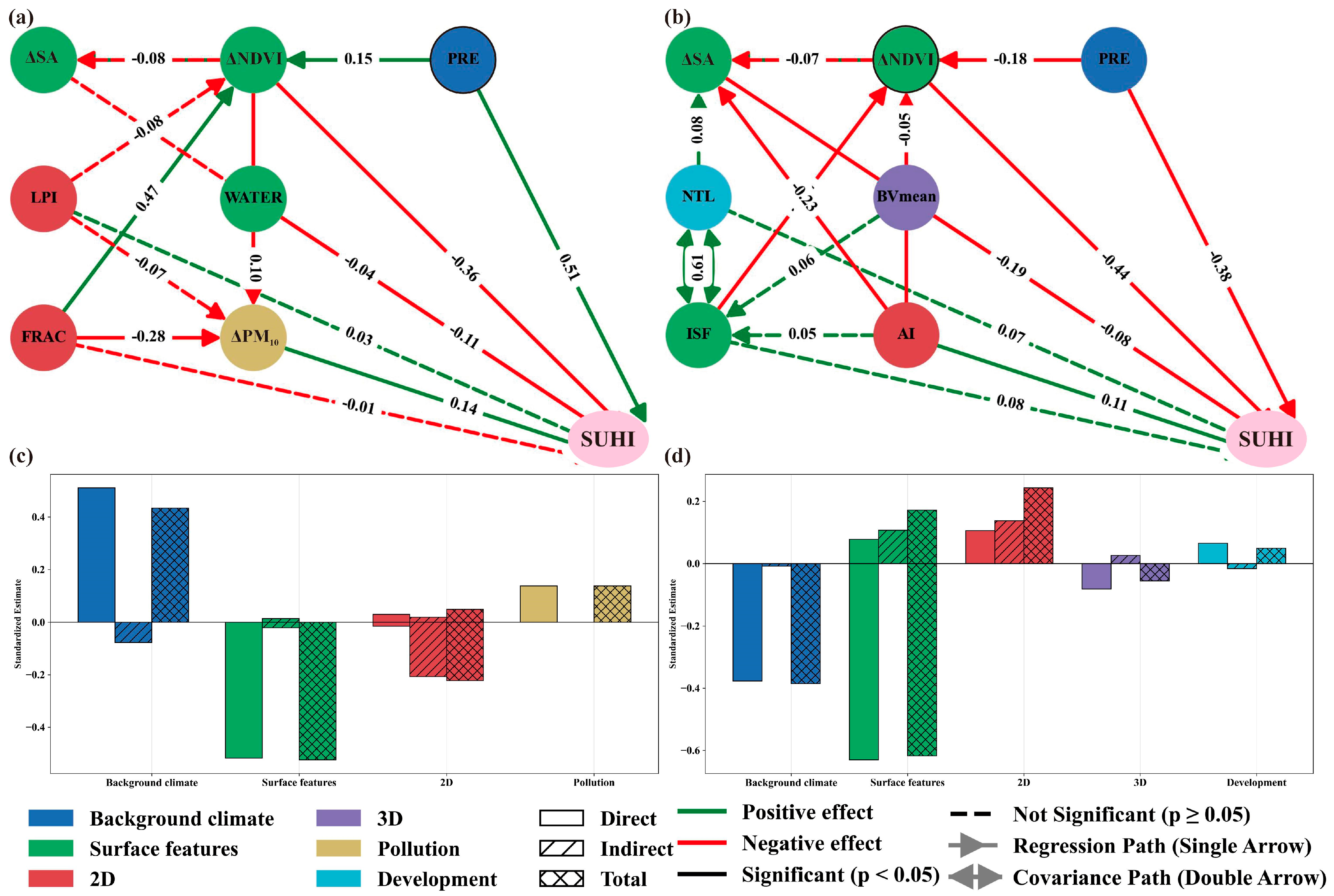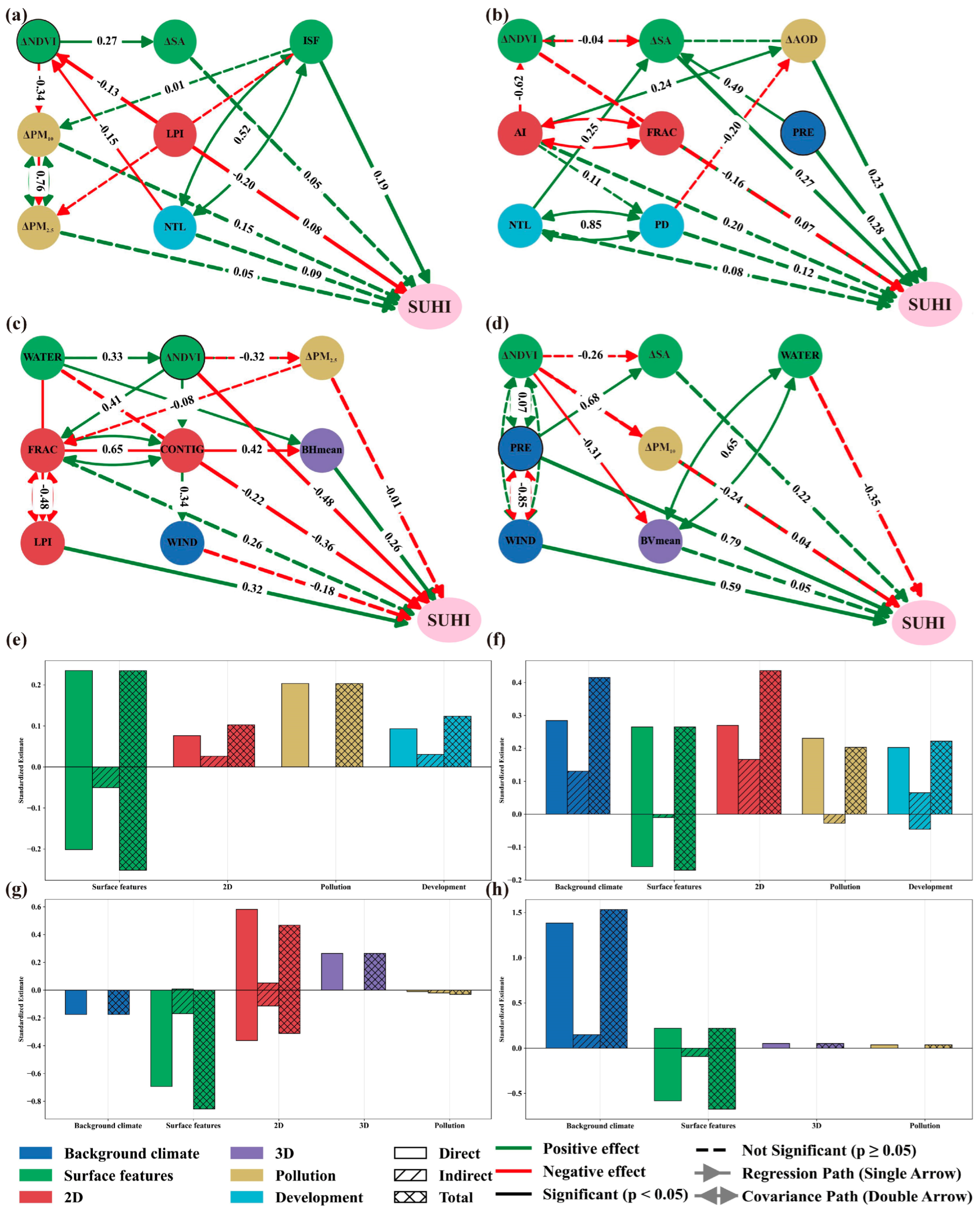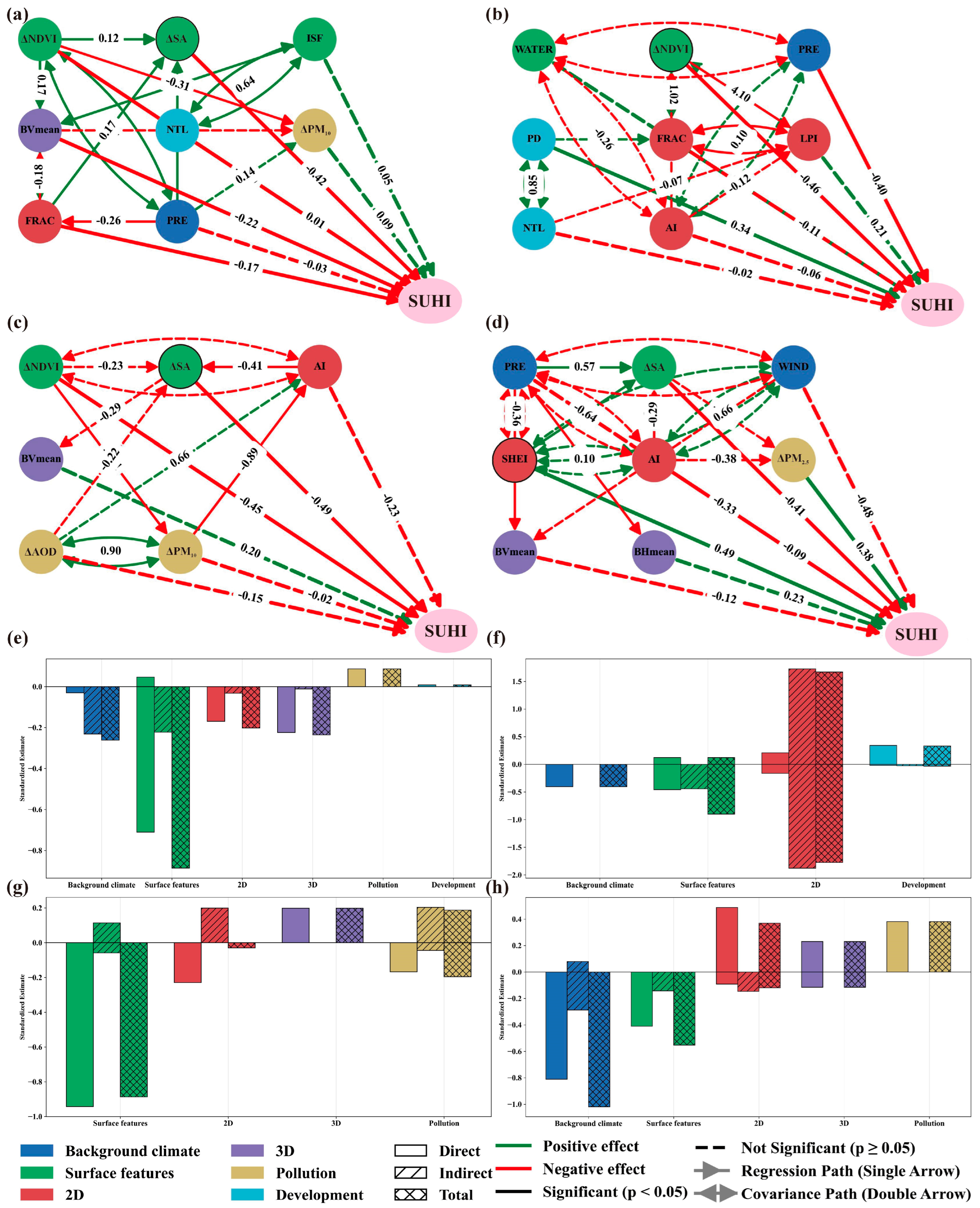 3.4. Structural Pathways of the Factors Influencing SUHIs Across Humid and Arid Regions