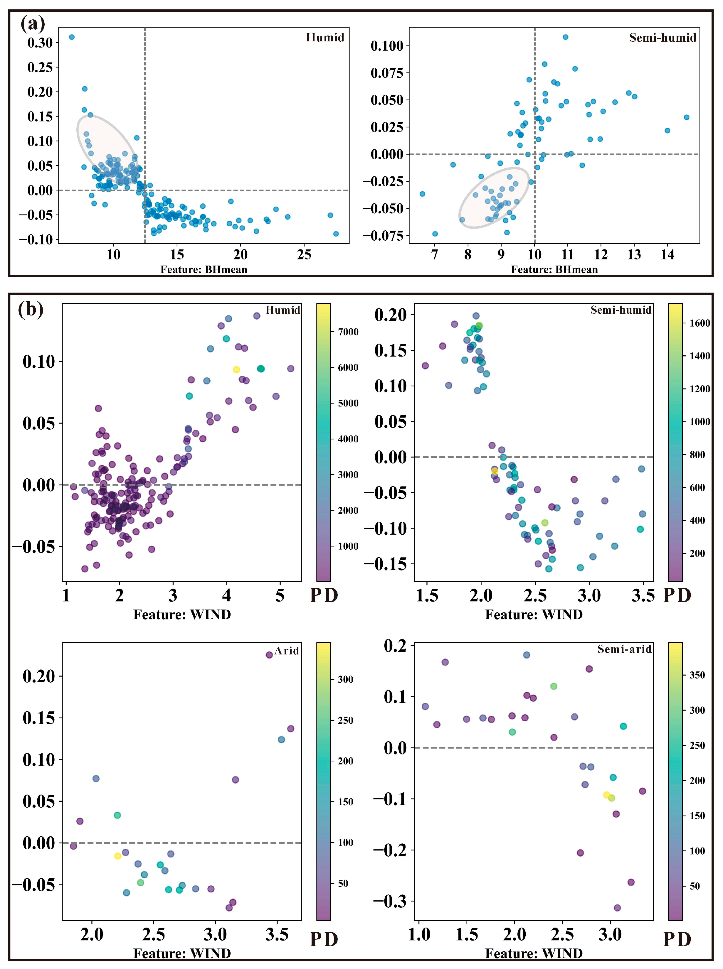 - What are the differences in the relative importance and contribution directions of various influencing factors across humid–arid regions?