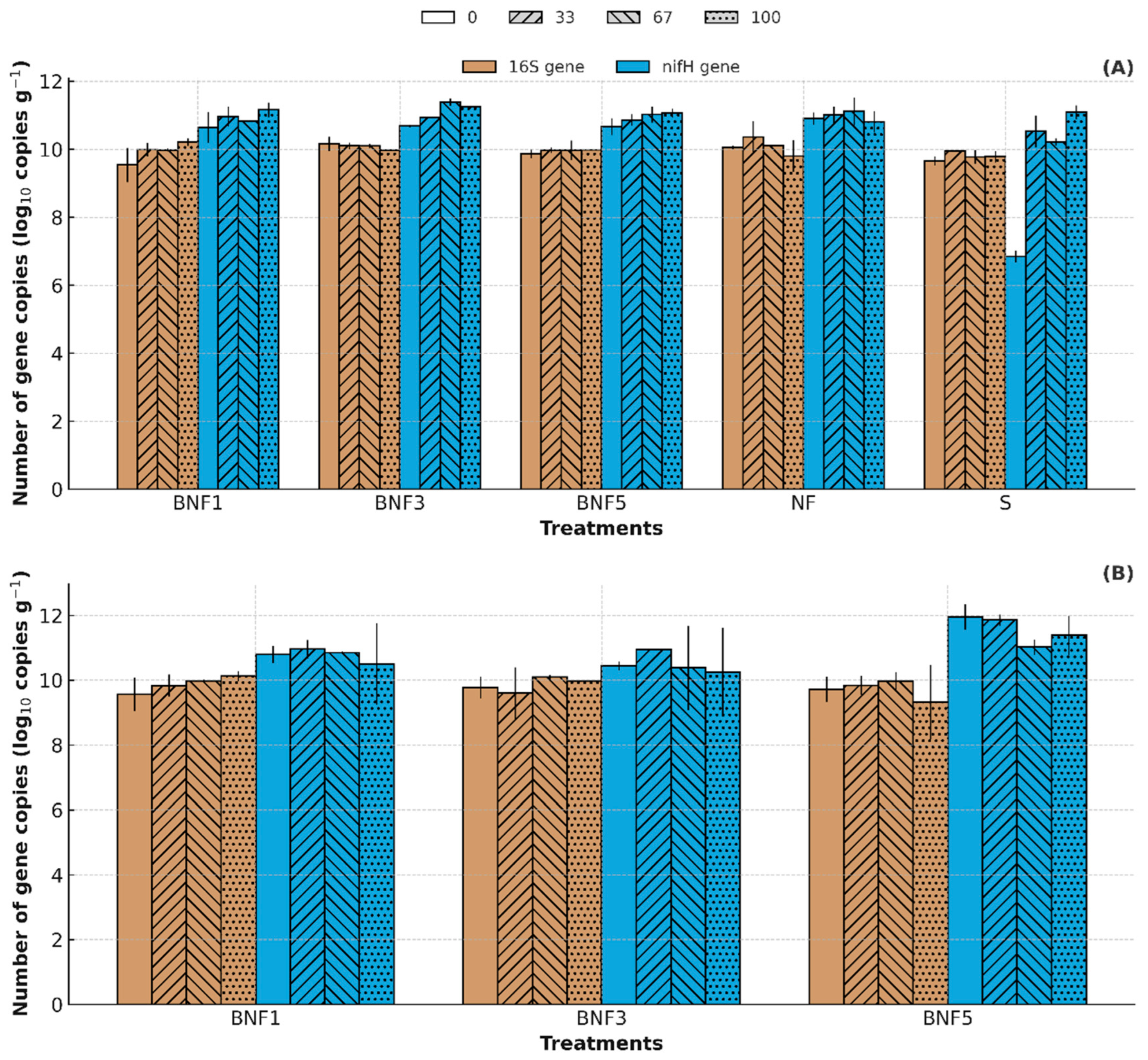 3.7. Abundance of 16S Gene and nifH Gene in Soil and Rhizosphere