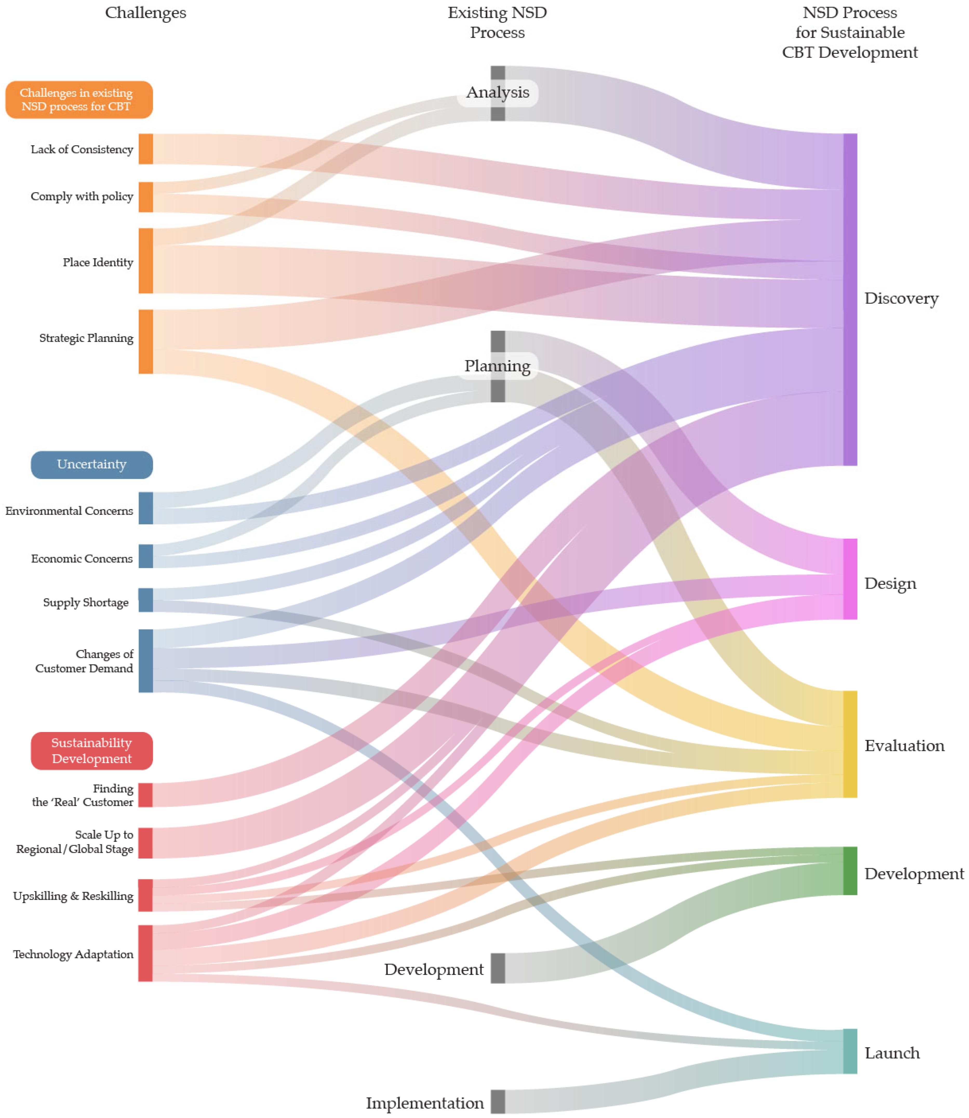 - Challenges in existing NSD process for CBT: Experts highlighted that many CBT communities either lacked a formal service development framework or relied on fragmented, reactive approaches. The most critical gaps identified were in strategic planning and place identity development, with experts consistently emphasizing that most CBT communities engaged only in short-term, project-based thinking rather than comprehensive long-term development planning, resulting in scattered and inconsistent initiatives. While various tools for place identity development existed, these resources remained fragmented, diverse, and inaccessible to resource-constrained communities, lacking a unified, community-appropriate approach. Moreover, current place identity development adopts a one-sided perspective, either prioritizing community viewpoints or visitor viewpoints, failing to achieve the balanced integration that addresses both community identity and visitor experience. Additionally, experts noted the lack of consistency in CBT practices and poor alignment with government policies, where existing CBT often failed to connect with national development directions and available support programs. These deficiencies often led to inconsistent visitor experiences and inefficient resource use, necessitating the development of a comprehensive NSD process that would begin with foundational assessment and planning phases.