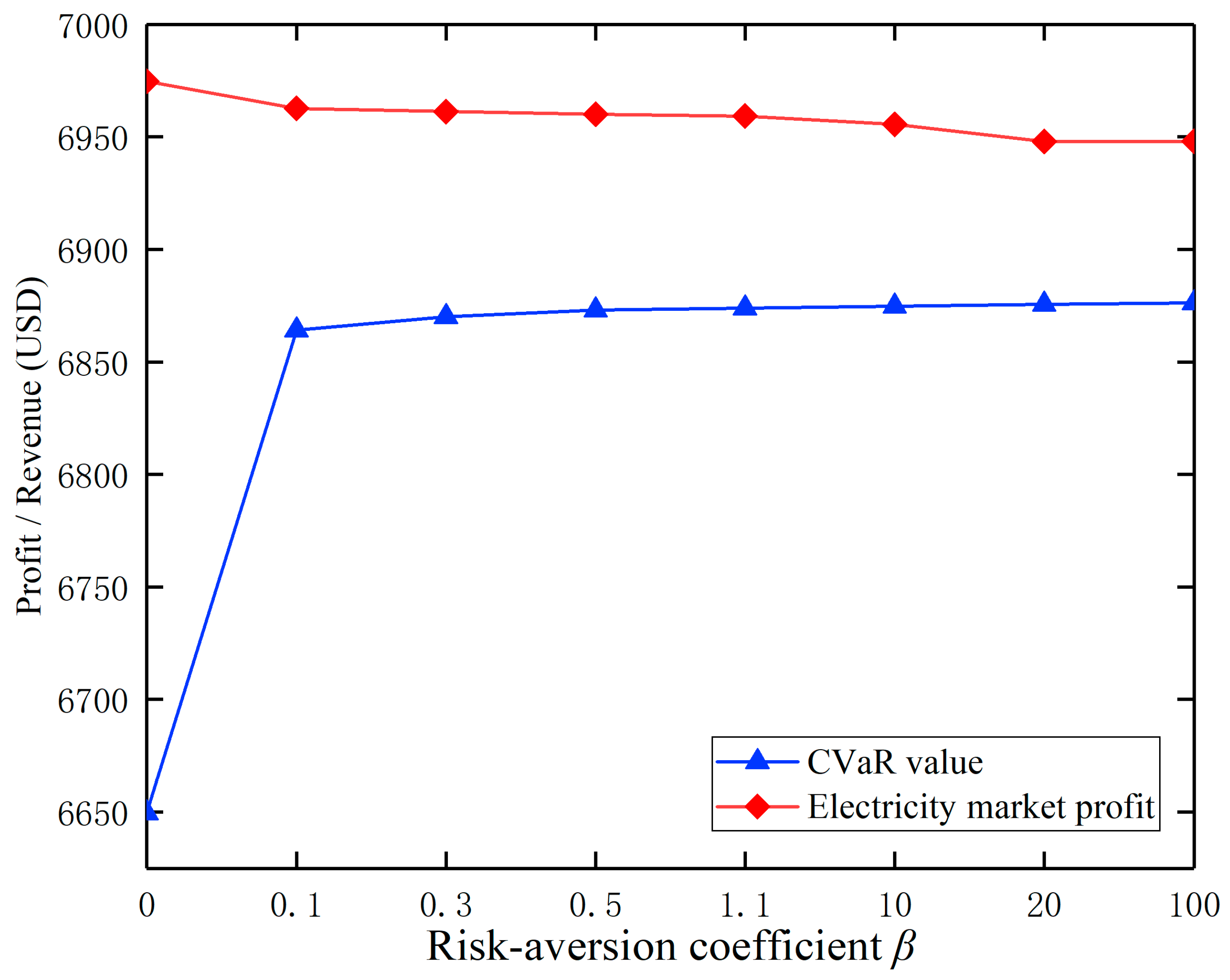 | β | Electricity Market Profit (USD) | CVaR Value (USD) | Revenue Change Relative to β = 0 | CVaR Change Relative to β = 0 |