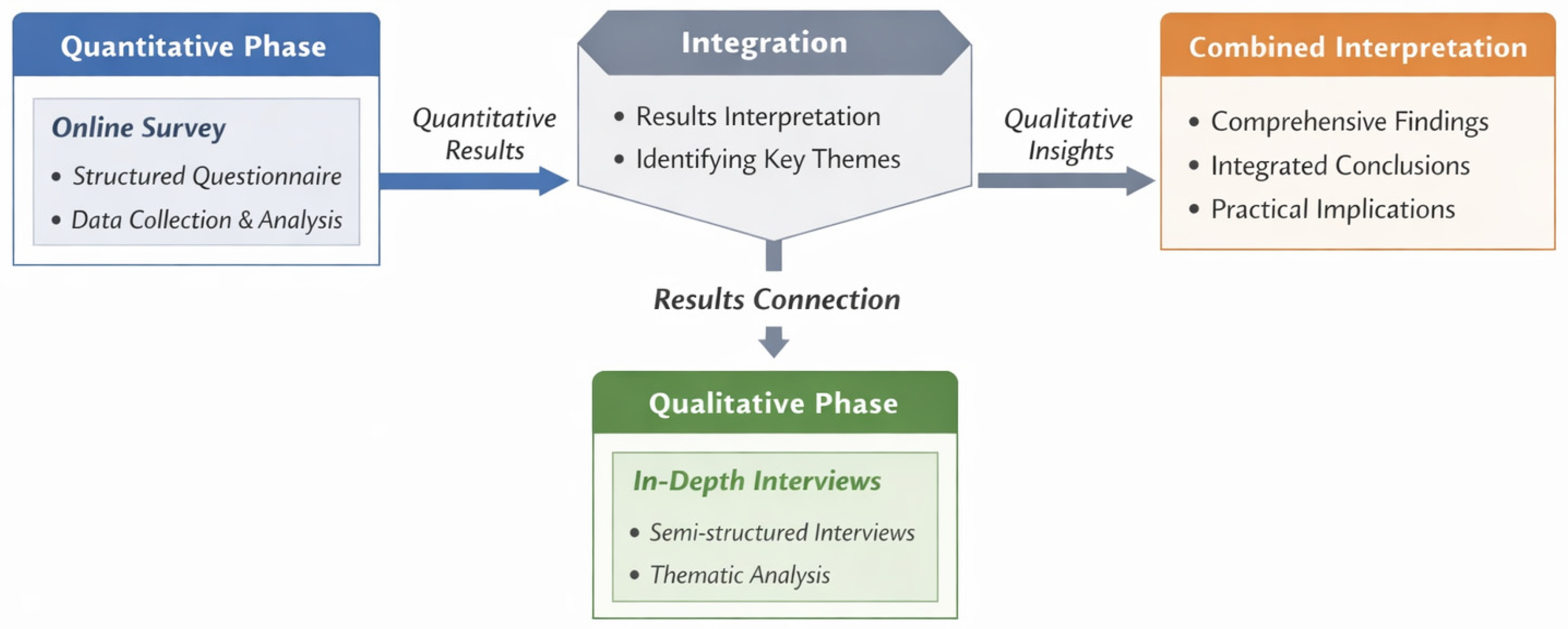 The study employed a mixed-methods research design to analyze the effect of AI-based personalization on consumers’ purchasing behavior. A mixed-methods strategy was selected because it capitalizes on the strength of both qualitative and quantitative methods by harnessing their strengths and offering an exhaustive description of the phenomenon under investigation. The quantitative part aimed to identify measurable patterns and relationships between AI personalization and consumer behavior, whereas the qualitative part aimed to acquire deeper insights into participants’ experiences, perceptions, and attitudes. The sequential design began with the completion of an online guided questionnaire and went on to conduct semi-structured interviews among a sample of respondents. This two-method approach allowed data triangulation, thereby improving the validity and reliability of the findings. The quantitative phase identified consumer trends, while qualitative phase complemented the results by discovering emotional and cognitive responses that could not be quantified using statistical methods. Accordingly, the study adopts an explanatory sequential mixed-methods design, in which quantitative findings are complemented and contextualized through qualitative inquiry to enhance interpretive depth and methodological rigor.