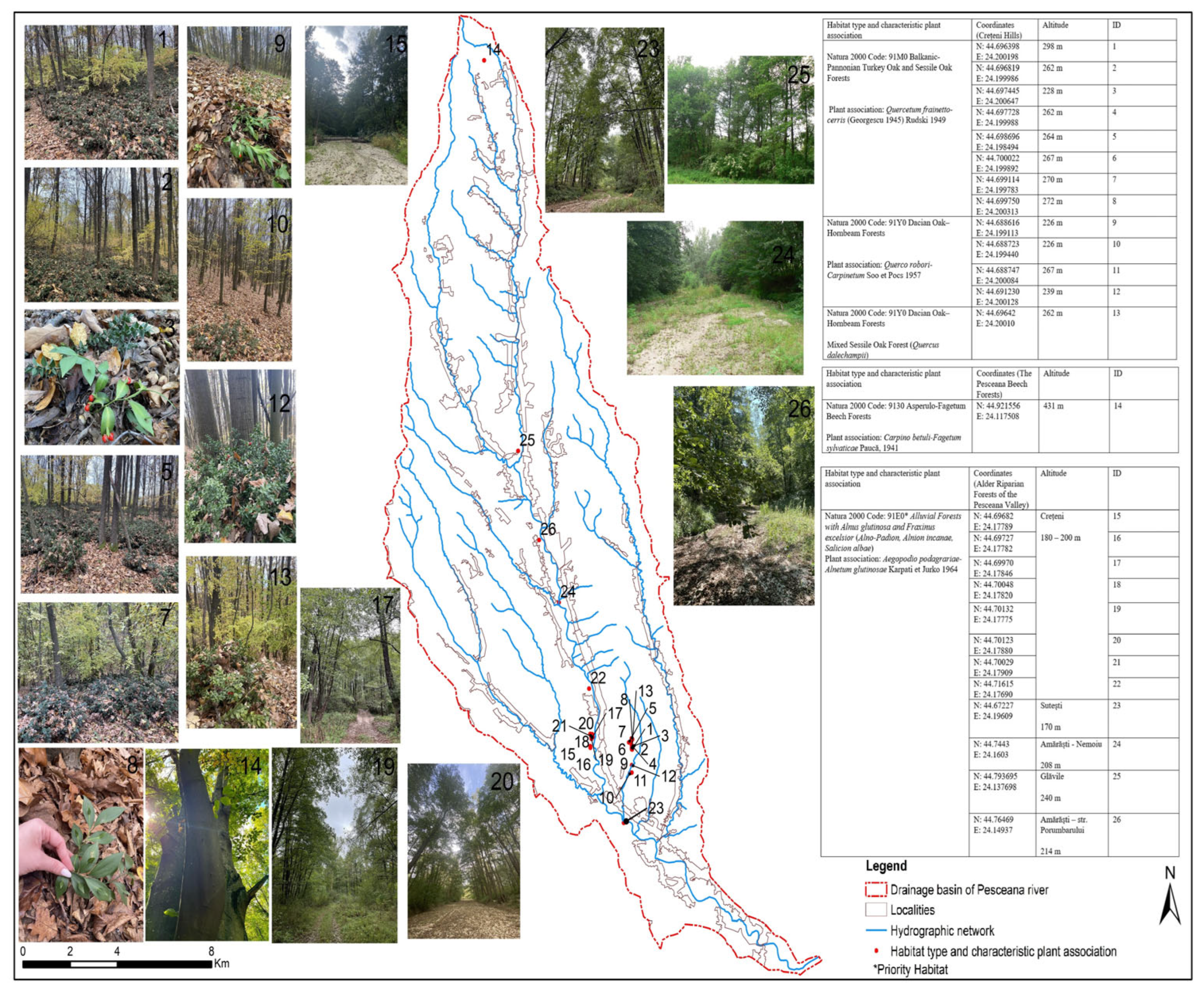 - Potentillo micranthae–Quercetum dalechampii [165]. This association includes mixed oak forests (Quercus dalechampii) with various understory plant species such as Potentilla micrantha.