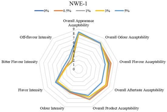 It can be assumed that NWE-1 has more biologically active compounds at a higher concentration [7] that can be associated with objectionable aromas and flavors in foods (e.g., proanthocyanidins [42]) compared to NWE-2. To confirm this hypothesis, extract profiling should be performed not only qualitatively but also quantitatively, followed by a repeat sensory study. This analysis directly supports the choice of 3% for NWE-1 and 5% for NWE-2 as optimal concentrations for antimicrobial activity testing in the model food matrix, balancing functional ingredient inclusion with sensory quality maintenance.