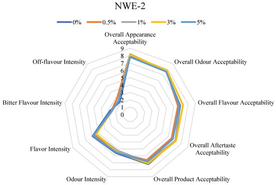 Sensory analysis further demonstrated that flavor attributes (bitterness and off-flavor intensity) were the primary factors limiting the extract inclusion levels in the meat analogue. NWE-2 could be incorporated at up to 5%, whereas NWE-1 remained acceptable only up to 3% without compromising the overall product quality.