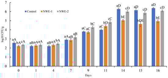 The initial microbial counts (Figure 3) were relatively low, ranging from 2.20 to 2.56 log CFU/g across all samples. This trend kept up to day 7; microbial growth remained minimal, with counts not exceeding 3.18 log CFU/g. A notable increase in microbial proliferation was observed from day 9 onward, which was particularly evident by day 11, when the NWE-2-enriched sample reached 4.85 log CFU/g and the control sample reached 3.99 log CFU/g. By day 14, the control exhibited a sharp escalation to 6.28 log CFU/g, staying within the typical spoilage threshold (6.0–7.0 log CFU/g) [43], while the NWE-1 and NWE-2 samples maintained lower values of 5.04 and 6.00 log CFU/g, respectively. This pattern continued through to day 16, with microbial loads of 6.38 log CFU/g for the control, 4.94 log CFU/g for NWE-1, and 6.08 log CFU/g for NWE-2. These findings clearly indicate that both plant extracts effectively delayed microbial proliferation compared to the untreated control, with NWE-1 demonstrating superior inhibitory activity throughout the storage period.