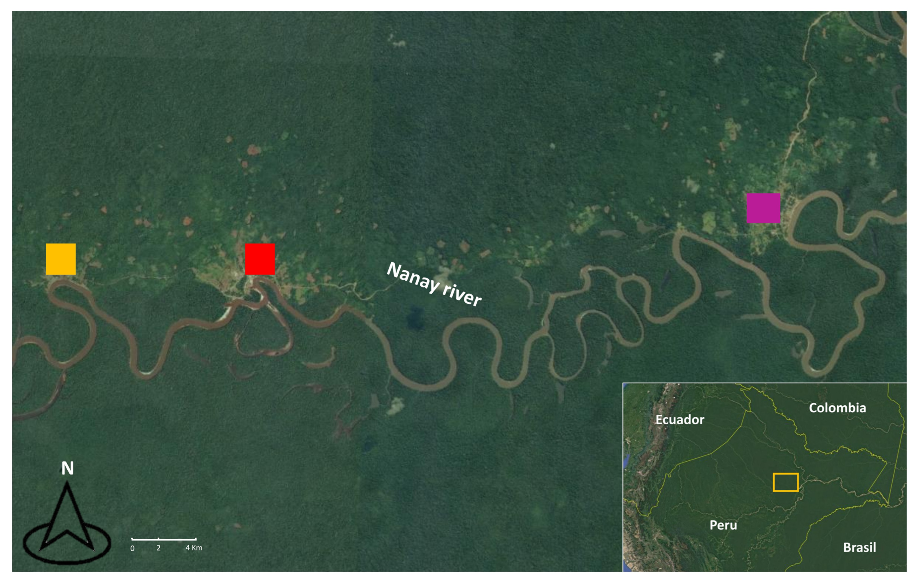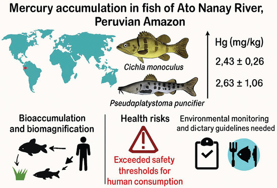 - Vega, C.M.; Pisconte, J.N.; García, C.; Torres, M.I.; Salcedo, K.D.; Fernandez, L. Evaluación de la Exposicion a Mercurio en Peces y en Pobladores de Comunidades Ribereñas de la Cuenca de los ríos Nanay y Pintuyacu (Loreto, Perú). 2024. Available online: https://cincia.org/wp-content/uploads/Informe-Mercurio-en-comunidades-de-Loreto.docx.pdf (accessed on 26 October 2025).